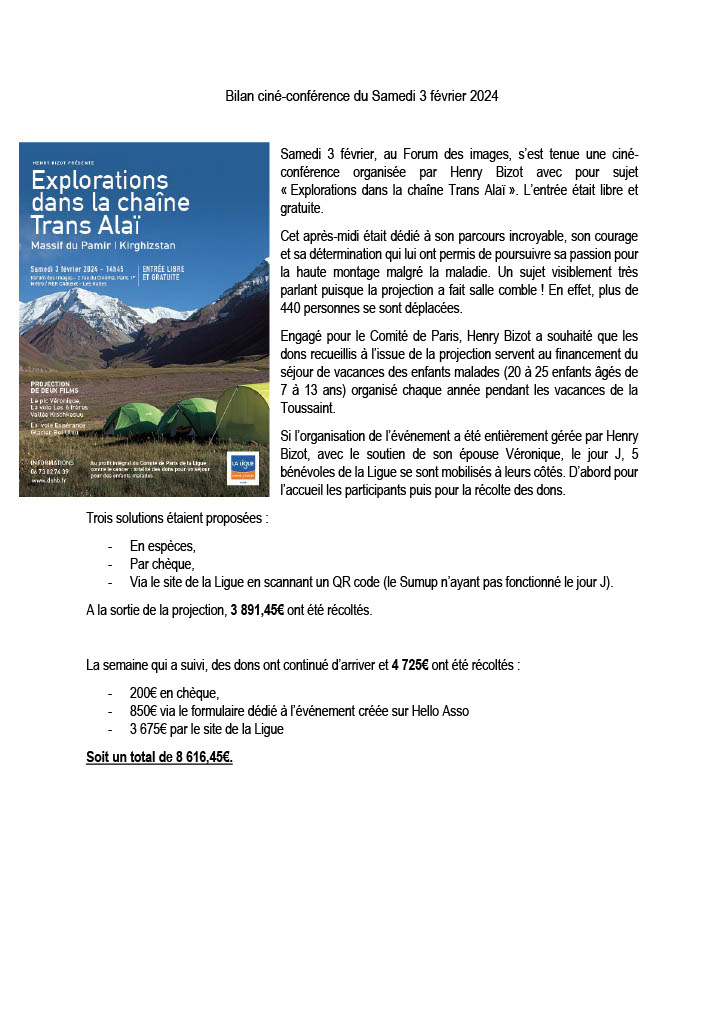 - À la fin de la journée du 3 février, la Ligue contre le cancer de Paris est partie avec l'intégralité des dons, et les a comptabilisés. Les fonds collectés, le jour J de la ciné-conférence du 3 février 2024, s'élèvent à : 3891,45 €. Trois solutions étaient alors proposées : en espèces - par chèque - via le site de la Ligue en scannant un QR code (mais le Sumup, ou terminal de paiement, n’a pas fonctionné le jour J).
