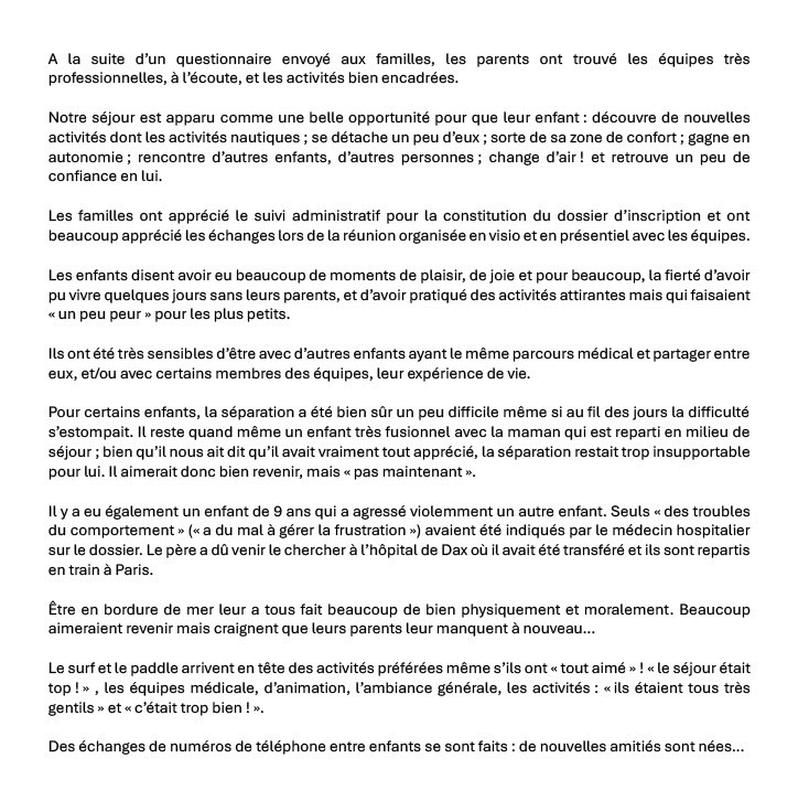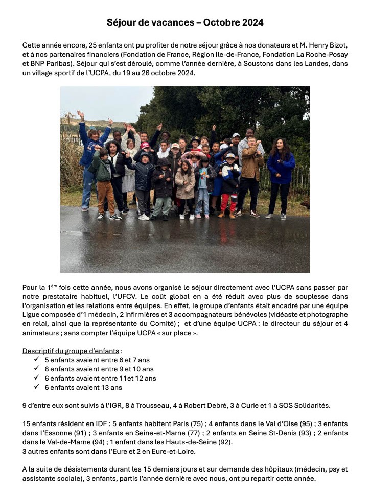 Grâce la participation de chaque donateur, le séjour de vacances, pour enfants atteints du cancer, a pu se réaliser, comme prévu, du 19 au 26 octobre 2024 à Soustons dans les Landes.