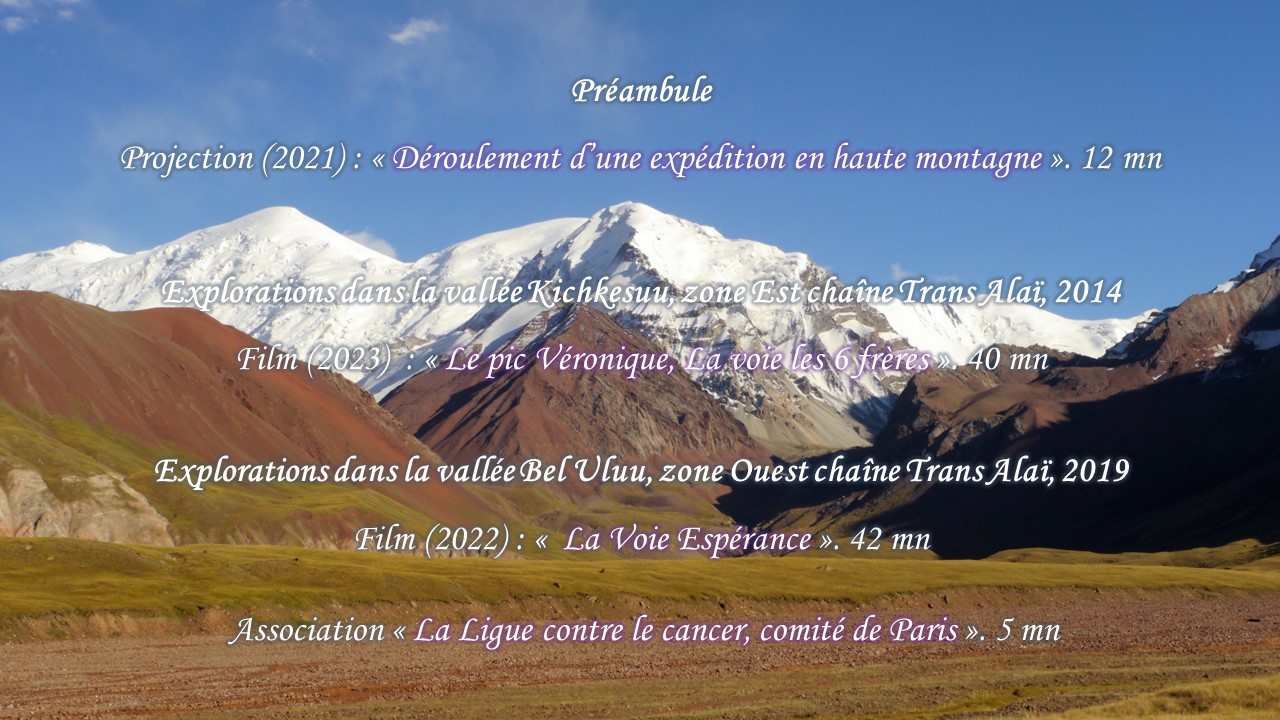 Ensuite, j'ai présenté les films "Le pic Véronique – La voie Les 6 frères", durée 40 mn, puis "La voie Espérance", durée 42 mn, que j'ai intégralement revus en resp. 2023 et 2022, qui racontent mes deux dernières expéditions dans des coins quasi-incognita d’Asie Centrale, au sein de la chaîne Trans Alaï située dans le Pamir au Kirghizstan - en 2015 dans la peu explorée vallée Kichkesuu, puis en 2019 dans la quasi-inexplorée vallée Bel Uluu qui débouche sur un glacier qui n’avait jamais été foulé auparavant - afin d'y réaliser, avec Nikolaï (Russie), des ascensions vierges. Des aventures au sein de paysages inoubliables, en immersion dans une nature rude et hostile, et aussi grandiose et mystérieuse, fascinante et attachante, pour des aventures qui furent, chacune à leur manière, extra-ordinaires. J'introduis chaque film en 3 mn afin de présenter, à l'aide de cartes, le lieu où se déroule l'expédition.