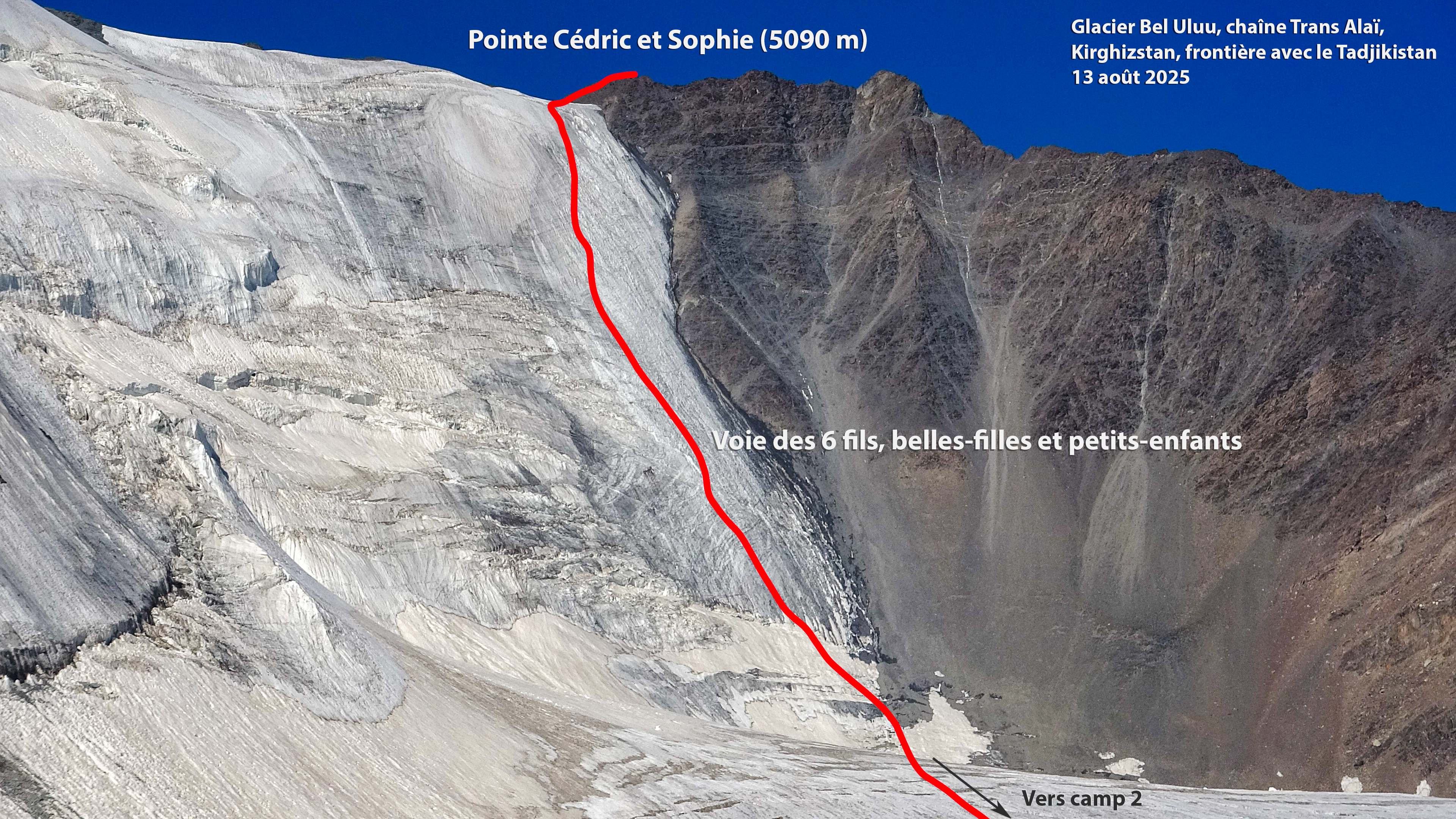 2025 - Asie centrale, Kirghizstan, chaîne Trans Alaï. Retour sur le glacier Bel Uluu, situé dans la partie ouest, quasi incognita, de la chaîne Trans Alaï , que nous avions découvert lors de l'expédition de 2019. Le 13 août, dans des conditions difficiles sur les faces en glace (ISO 0°C à 6500 m), ascension d'un sommet 5090 m vierge, au fond à l'ouest du glacier Bel Uluu, à la frontière avec le Tadjikistan.Trois kilomètres pour traverser le glacier et rejoindre le pied d'une face en glace, ascension de la face jusqu'à 60° qui débouche sur un col puis au sommet. Itinéraire coté D+ dans ces conditions. Nom de baptème du sommet : La pointe Cédric et Sophie, en russe Седрик и Софи. Itinéraire baptisé La voie les 6 fils, belles-filles et petits enfants, en russe Путь шесть сыновей, невесток и внуков. Avec Gabriel Fava.