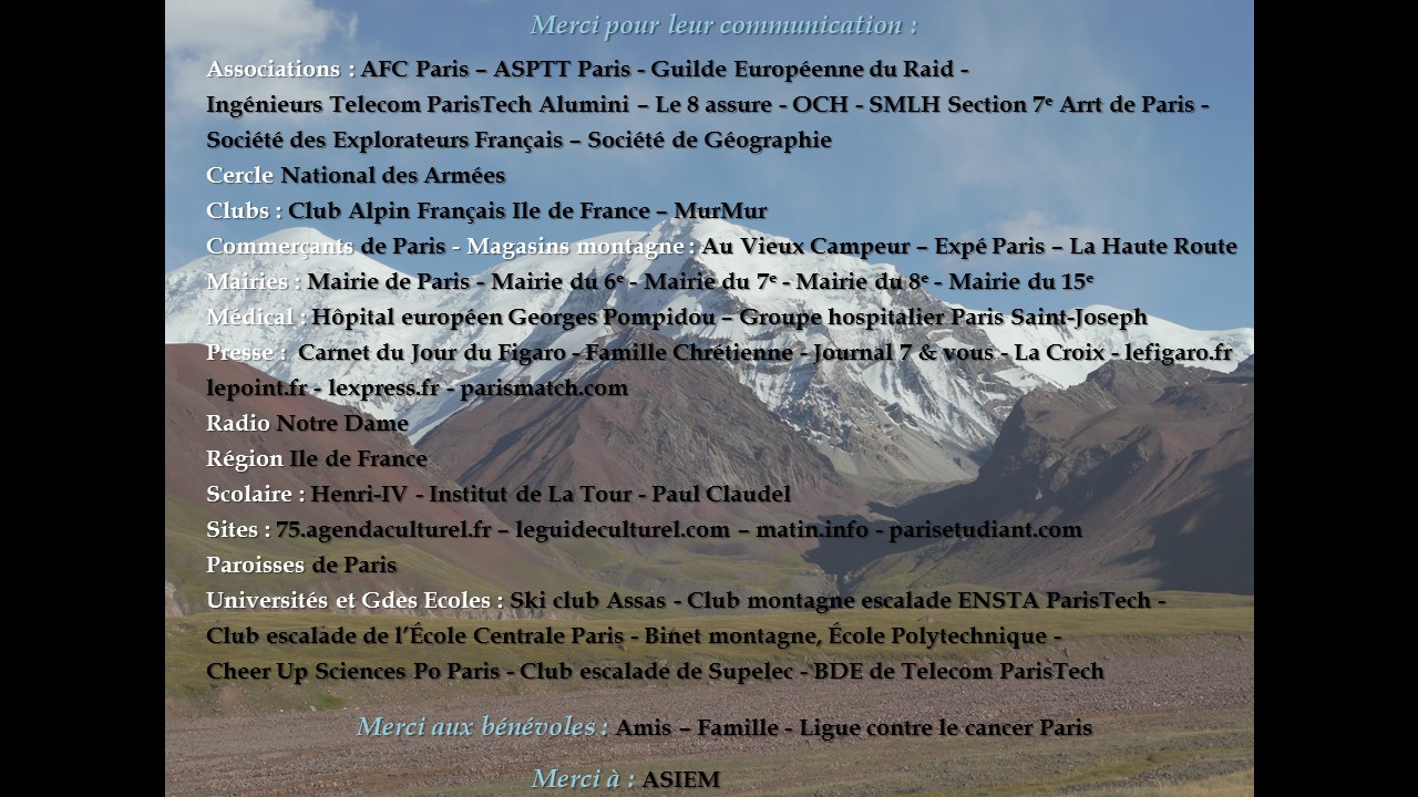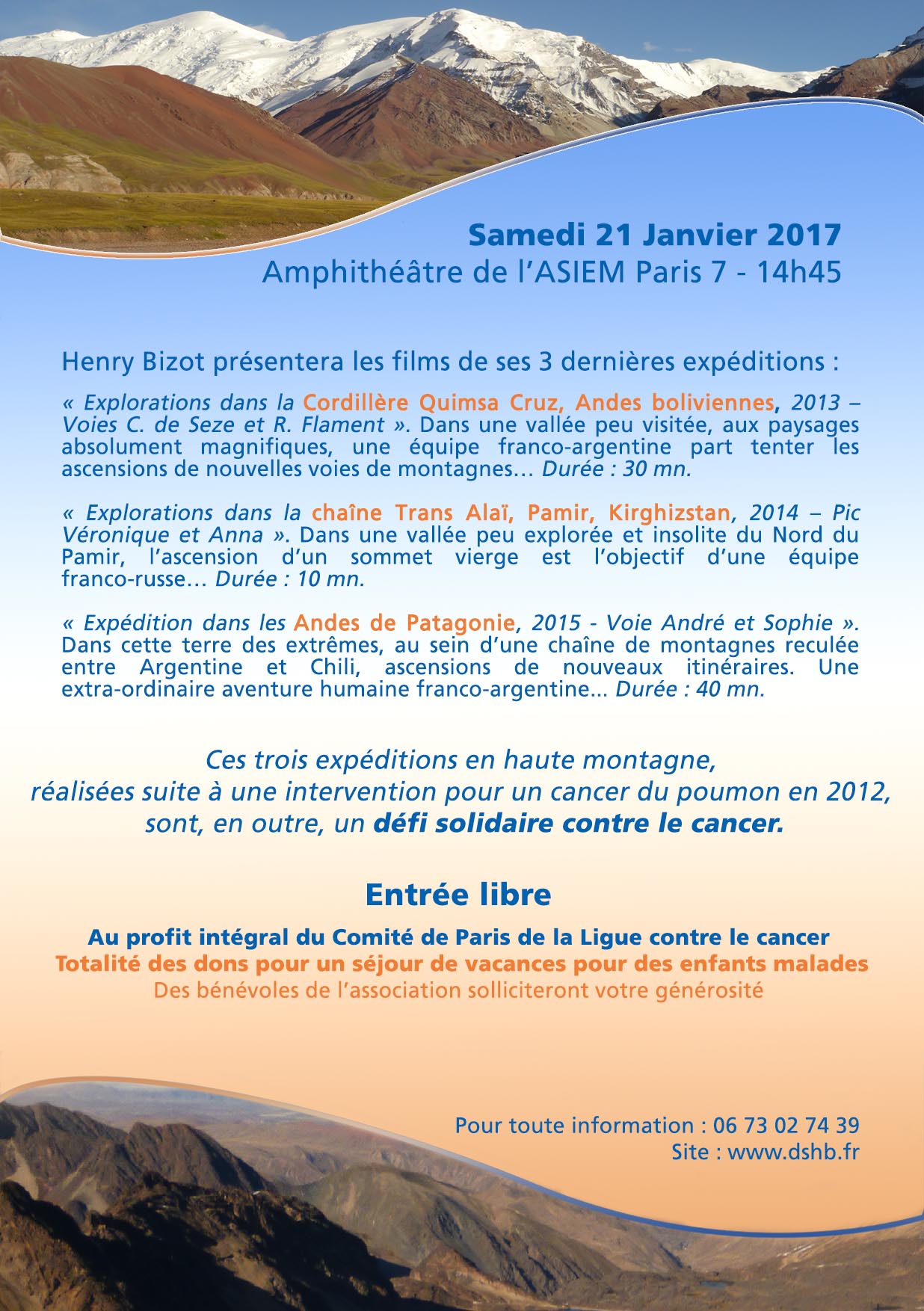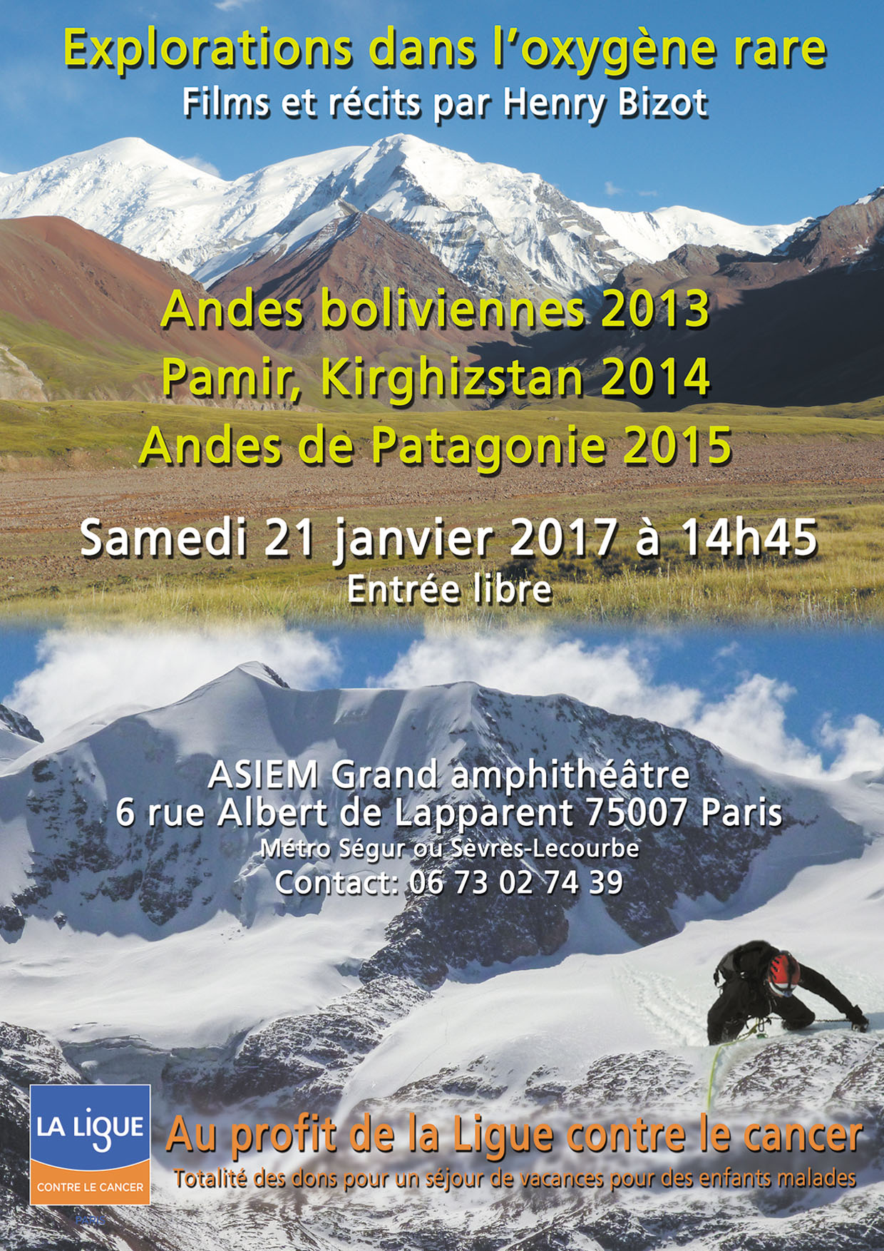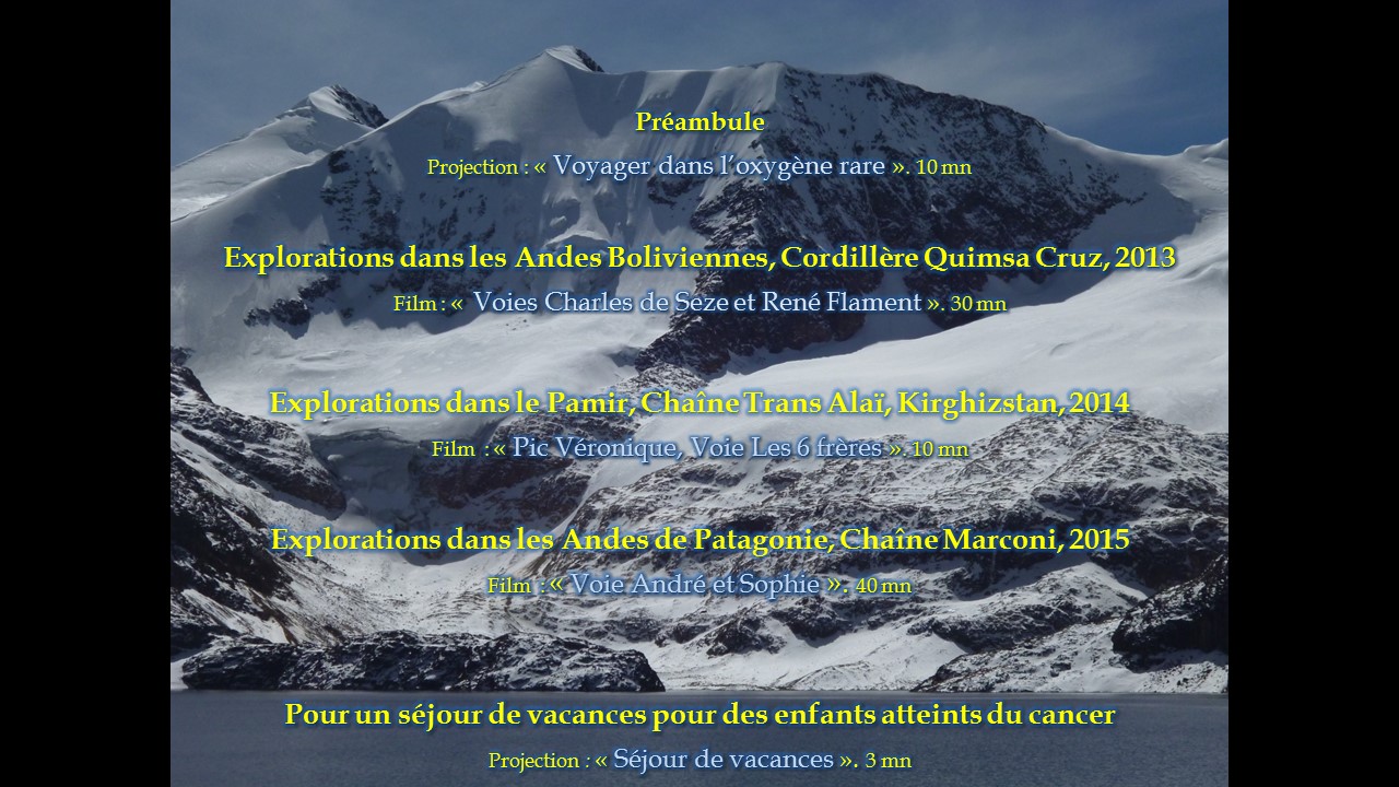 J'ai présenté les films que j'ai réalisés sur mes trois dernières expéditions dans des vallées et des massifs montagneux peu explorés, des Andes Boliviennes en 2013 avec Gabriel (Argentine), du Pamir en 2014 avec Nikolaï (Russie), et de la Patagonie en 2015 avec Gabriel (Argentine).