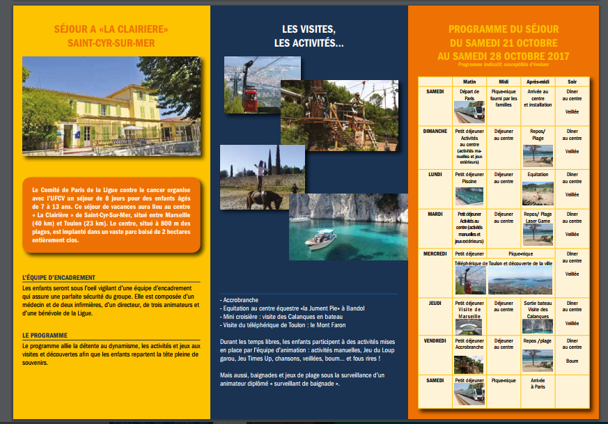 Le séjour de cette année 2017, a pu être organisé, par la Ligue contre le cancer de Paris, du 21 au 28 octobre, grâce à la participation de la totalité des fonds qui avaient été collectés à la fin de la ciné-conférence du 21 janvier à Paris 7e : informations et compte-rendu en images de cette séance, descendre ci-dessous dans la présente page. Un séjour avec un programme très riche d’activités : voir brochure ci-dessous.