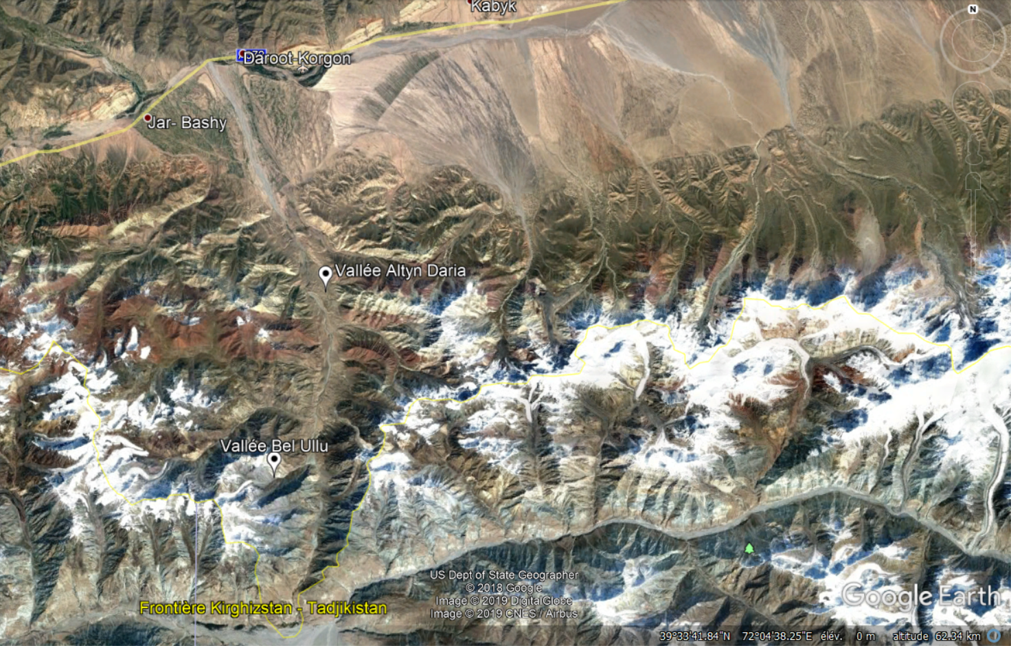 Parenthèse : La vallée aboutit à son sud à la frontière avec le Tadjikistan. Depuis la disparition de l'empire soviétique, le tracé des frontières a fait l'objet de désaccords entre les deux pays ; ces litiges ont débouché sur des conflits, les derniers datent de 2021 et 2022 et sont liés à des différents sur l'accès à la terre et à l'eau. Mais cette année 2025 les deux pays ont pu trouver un accord, ce dernier marque la fin des zones contestées et permet une délimitation précise de la frontière, ainsi que la démarcation physique sur le terrain. Suite à cet accord, les points de contrôle frontaliers de Kyzyl-Bel et Kayragach, fermés depuis plusieurs années, ont été rouverts. Néanmoins, tel que je l'ai compris sur place, des contrôles sont toujours en place pour la surveillance de divers trafics, entre autre dans cette zone de la vallée Altyn Daria qui débouche à son sud sur le Tadjikistan, elle-même frontalière avec l'Afghanistan.