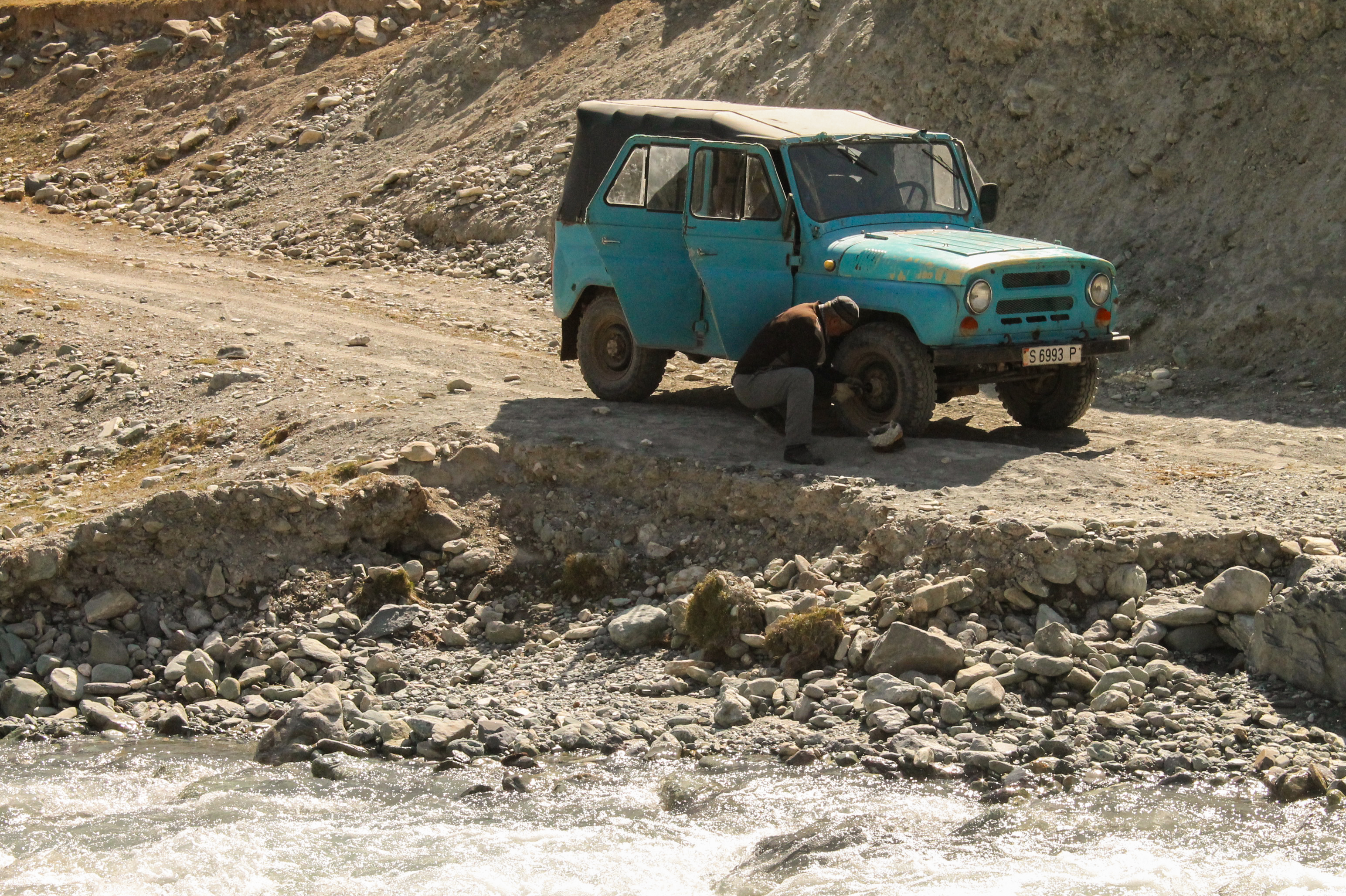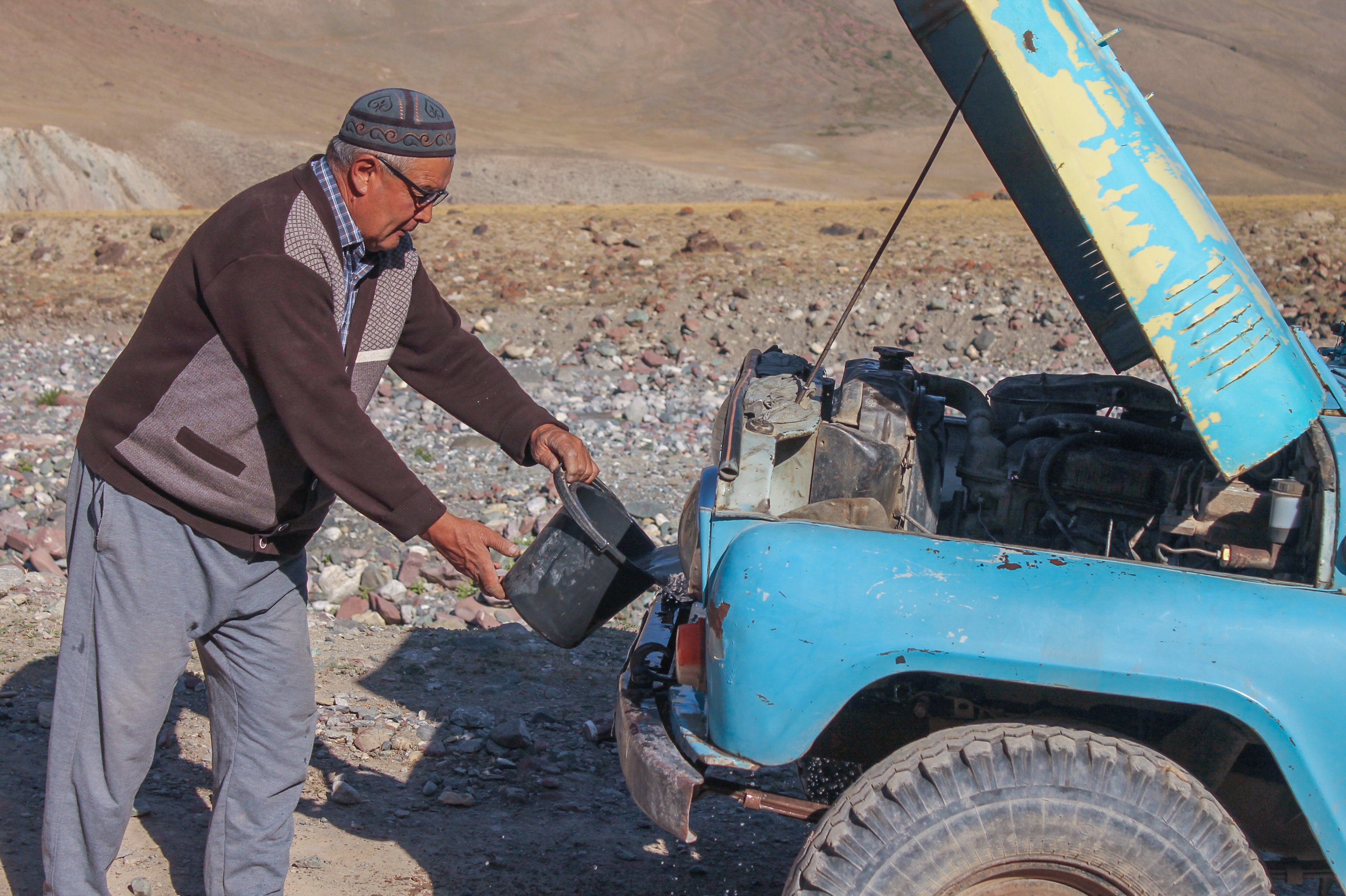 À plusieurs reprises, notre conducteur arrête son véhicule afin de refroidir le moteur avec un bidon d'eau. Ce véhicule est vraiment vétuste, par exemple, pour passer en 4X4, il faut changer manuellement des boulons sur les roues avant.