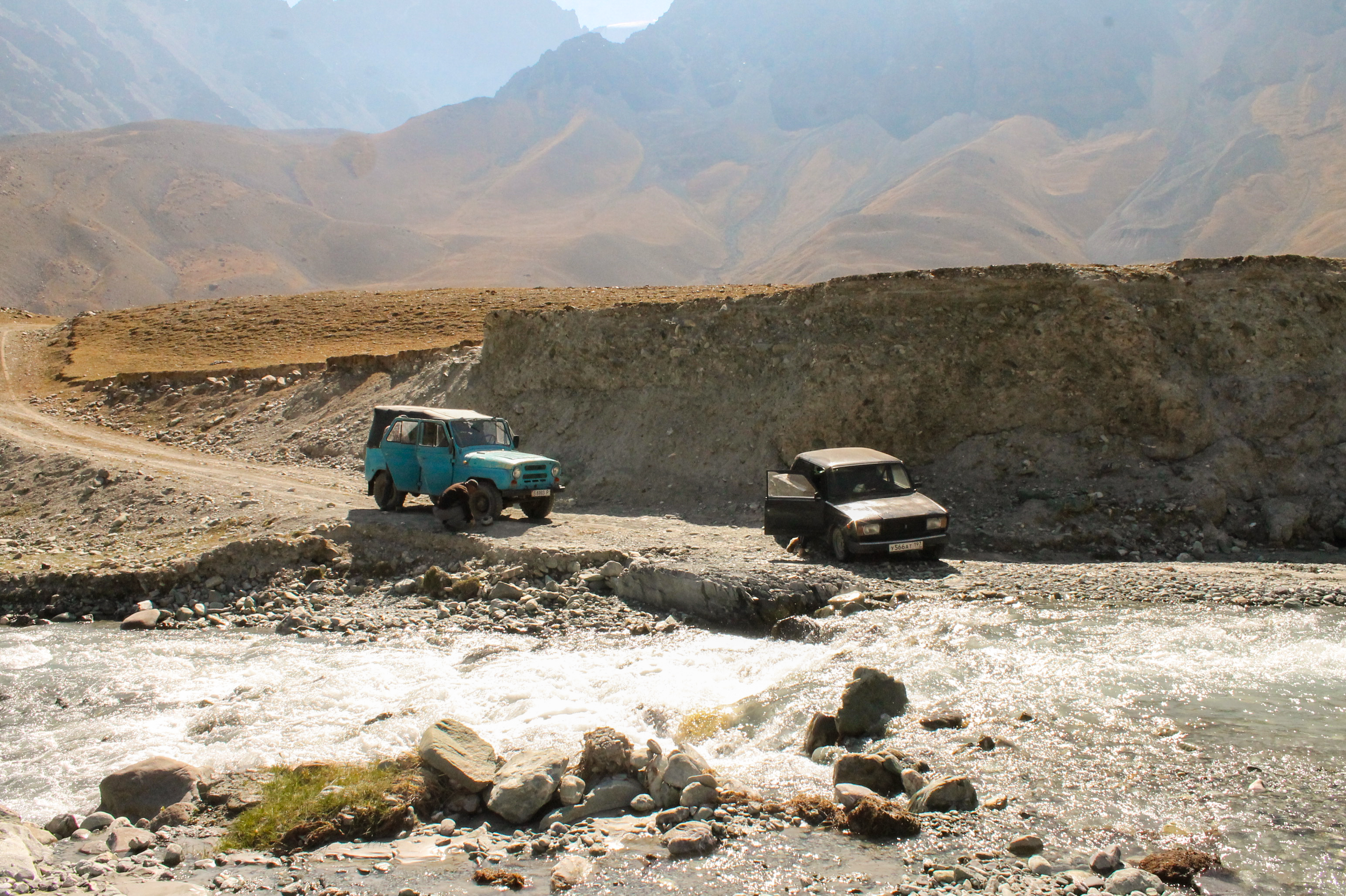 Nous reprenons notre déplacement vers le camp de base. Sur notre parcours, une vieille "bagnole" est abandonnée, sans conducteur, au bord de la rivière, juste à l'endroit où nous devons la franchir. On tente de la déplacer, impossible. Yelal enlève alors quelques grosses pierres dans la rivière pour la franchir à un autre endroit. Nous remontons dans le véhicule, interrogatif sur sa capacité de franchir le cours d'eau, compte tenu de son débit et des blocs de pierre qui la jalonnent ; c'est encore une fois sans compter sur la puissance de ce vieux véhicule et aussi l'habilité de son conducteur. La rivière franchie, nous rejoignons la zone où je souhaite implanter notre camp de base.
