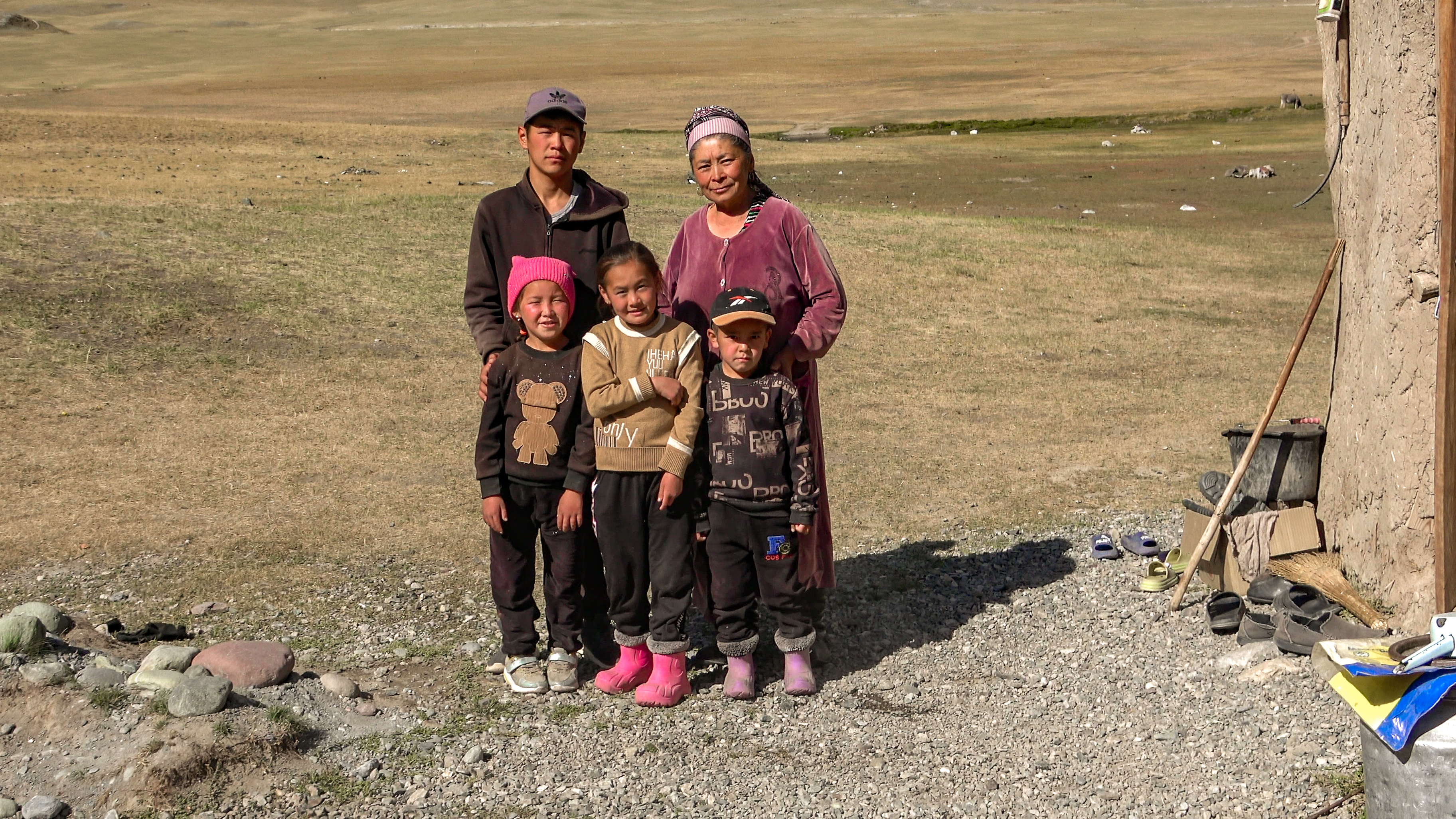 À environ cinq kilomètres du camp de base, Yelal emprunte une piste en direction de l'ouest. Nous essayons de lui préciser que nous ne sommes pas sur le bon chemin, il ne répond pas et poursuit sa route, déterminé ! Bref, on verra bien, on a le temps aujourd'hui. En parvenant à un bâtiment en terre battue et des annexes, nous comprenons que nous sommes dans le camp de la famille de Yelal. Il n'y a pas de yourte, contrairement au camp, situé plus au nord, que j'avais visité en 2019. Nous sommes accueillis par la femme de Yelal et leurs petits-enfants ; leurs parents les ont confié aux grands-parents durant les vacances d'été. Nous partageons le thé dans le bâtiment de vie, c'est la tradition locale.