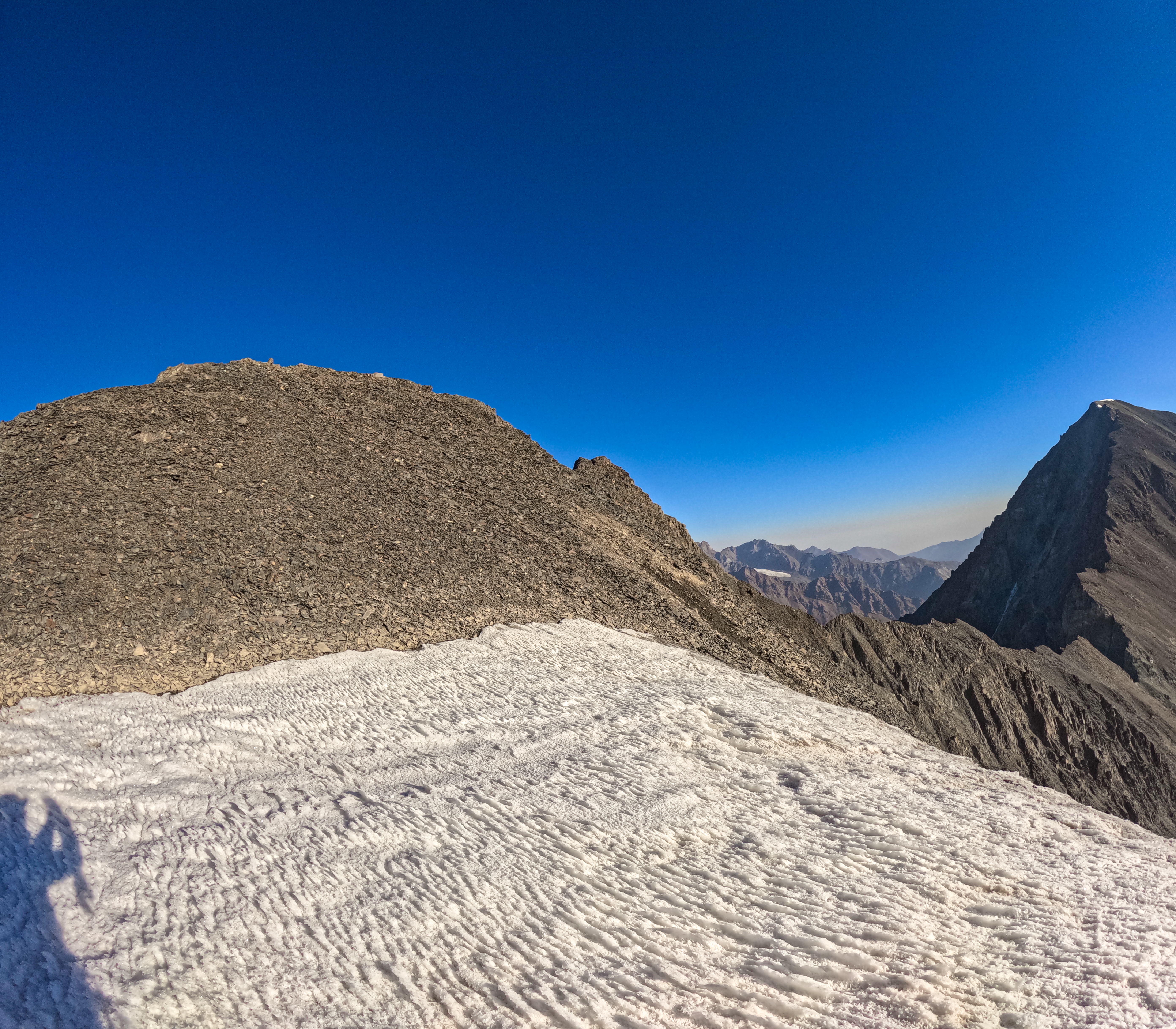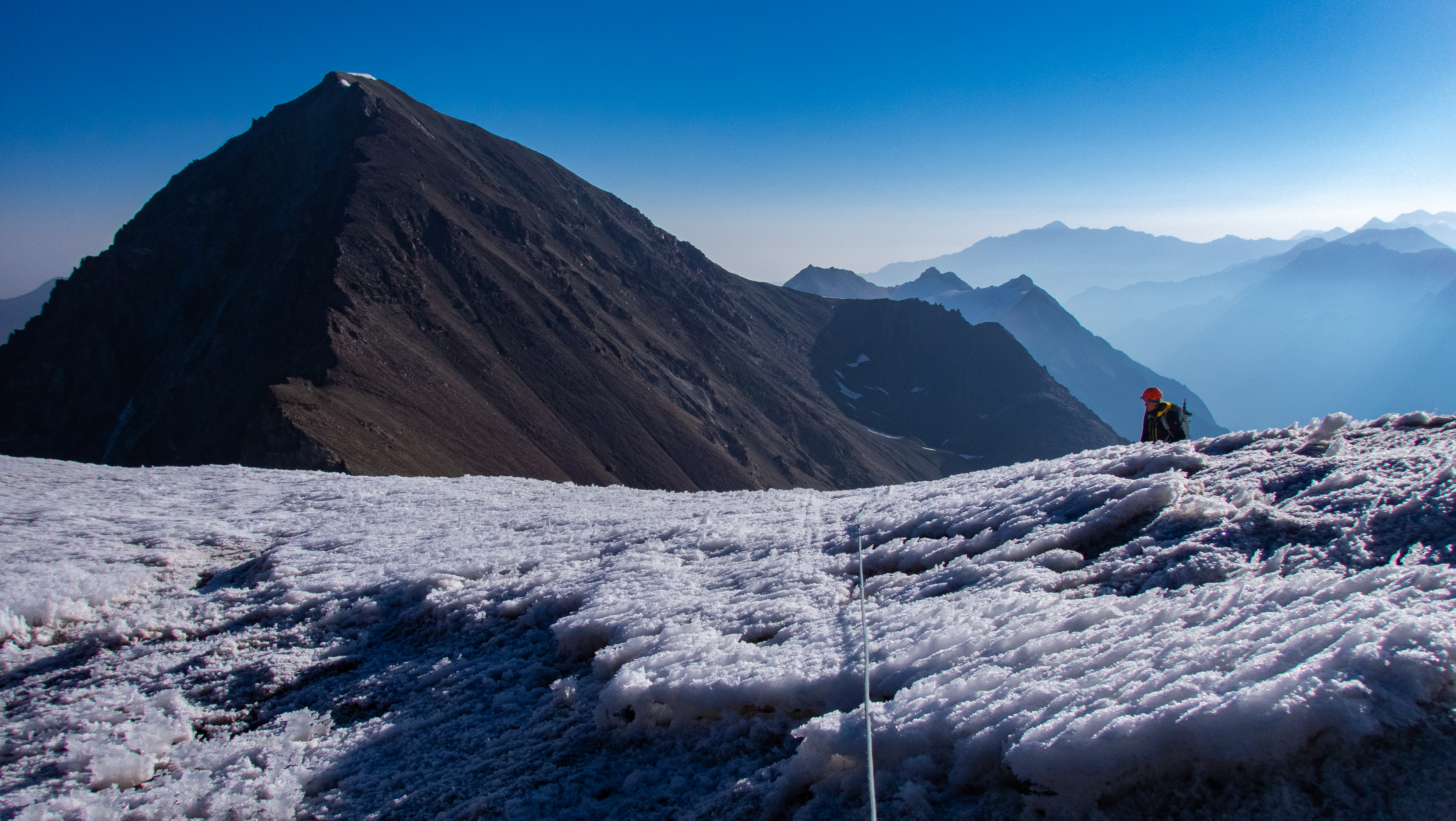 2h45 plus tard, nous débouchons de la face et aboutissons sur un col, à la frontière avec le Tadjikistan.