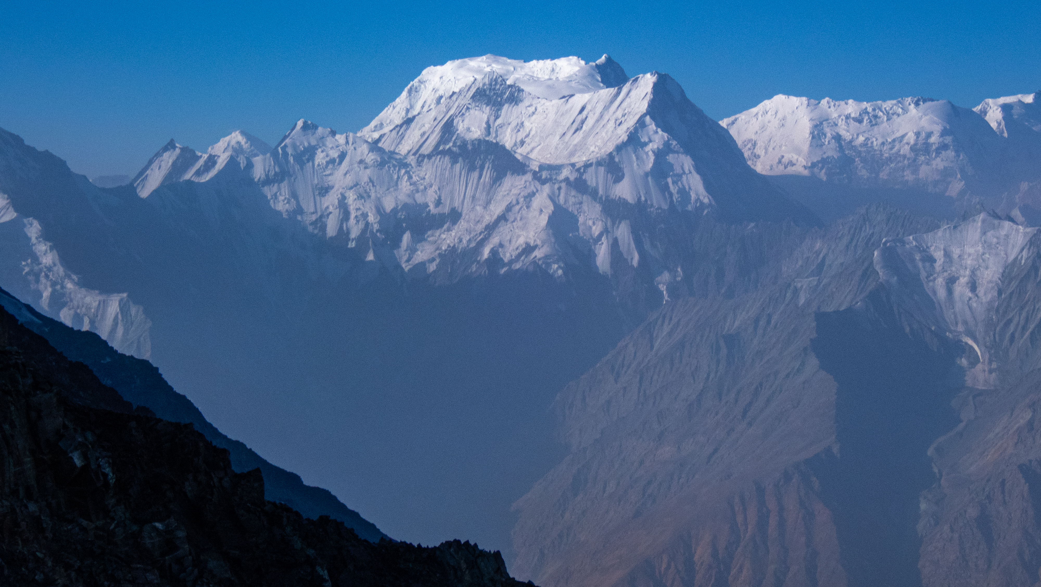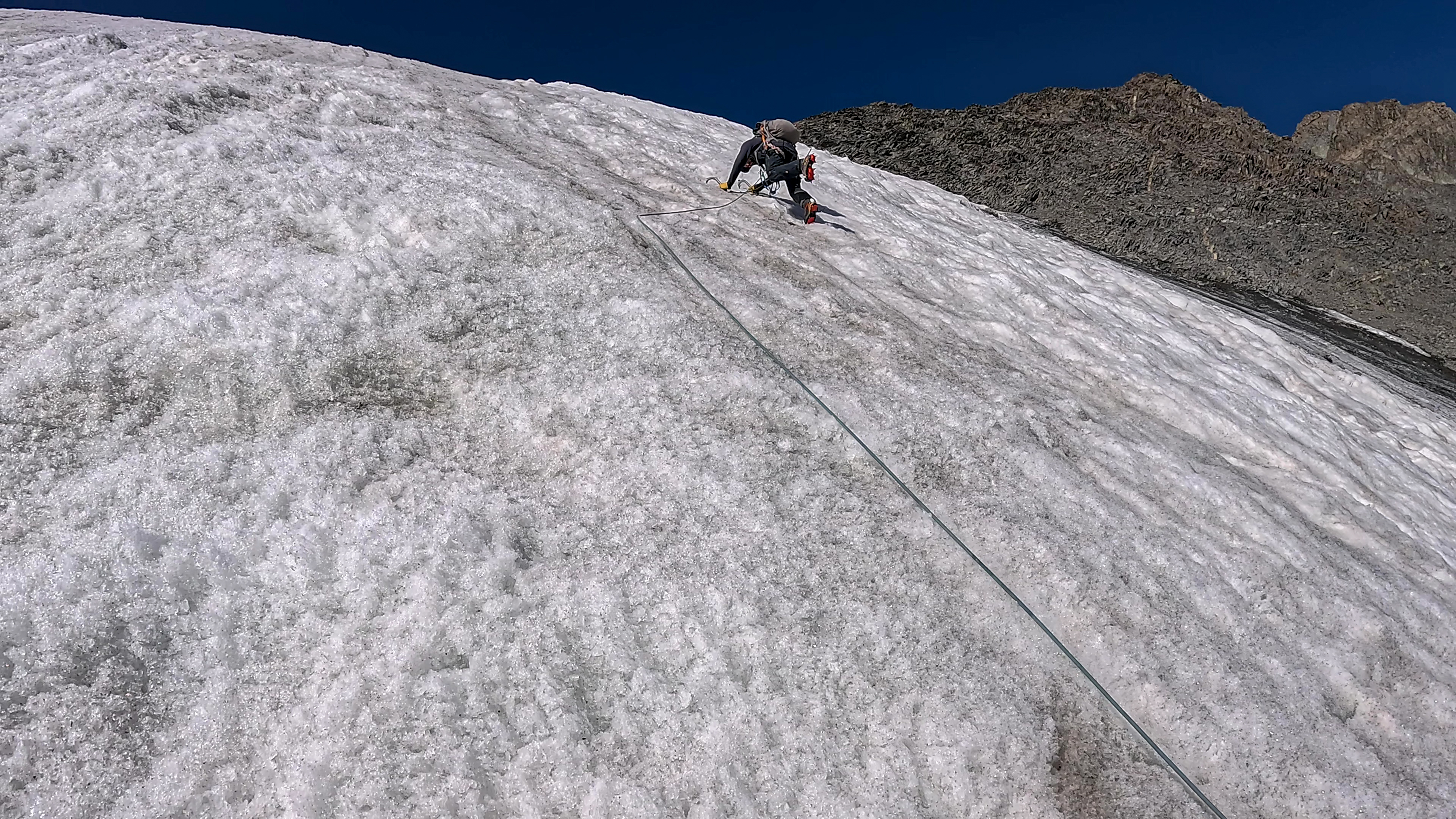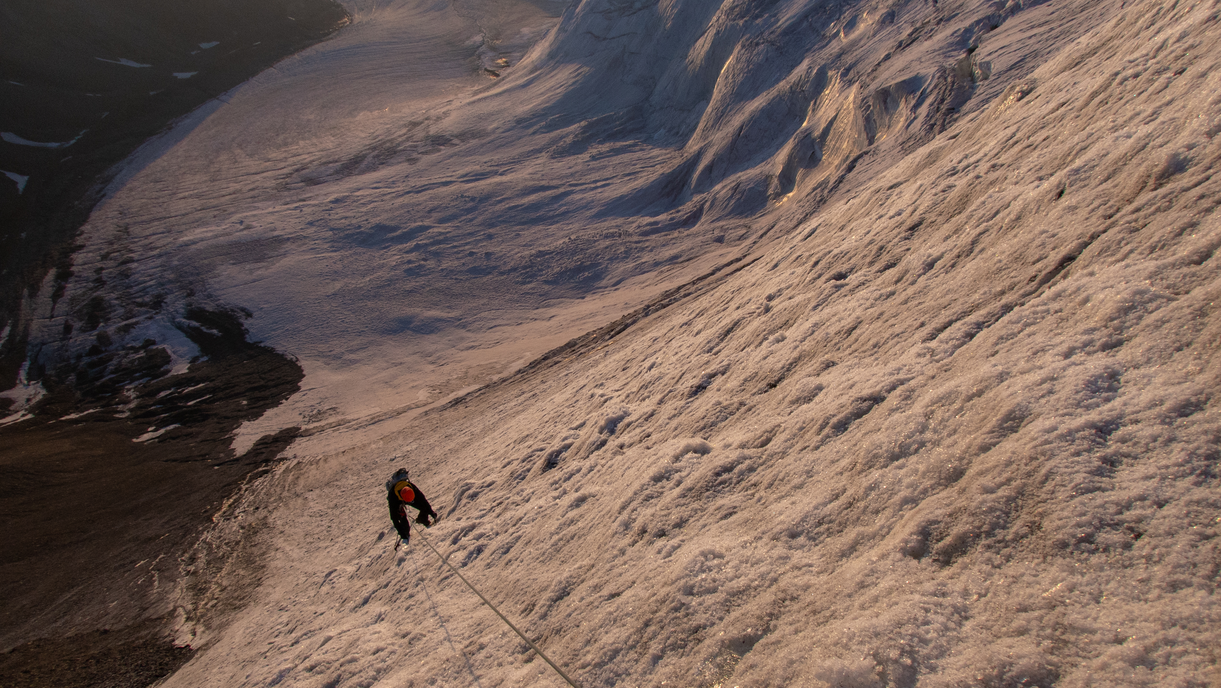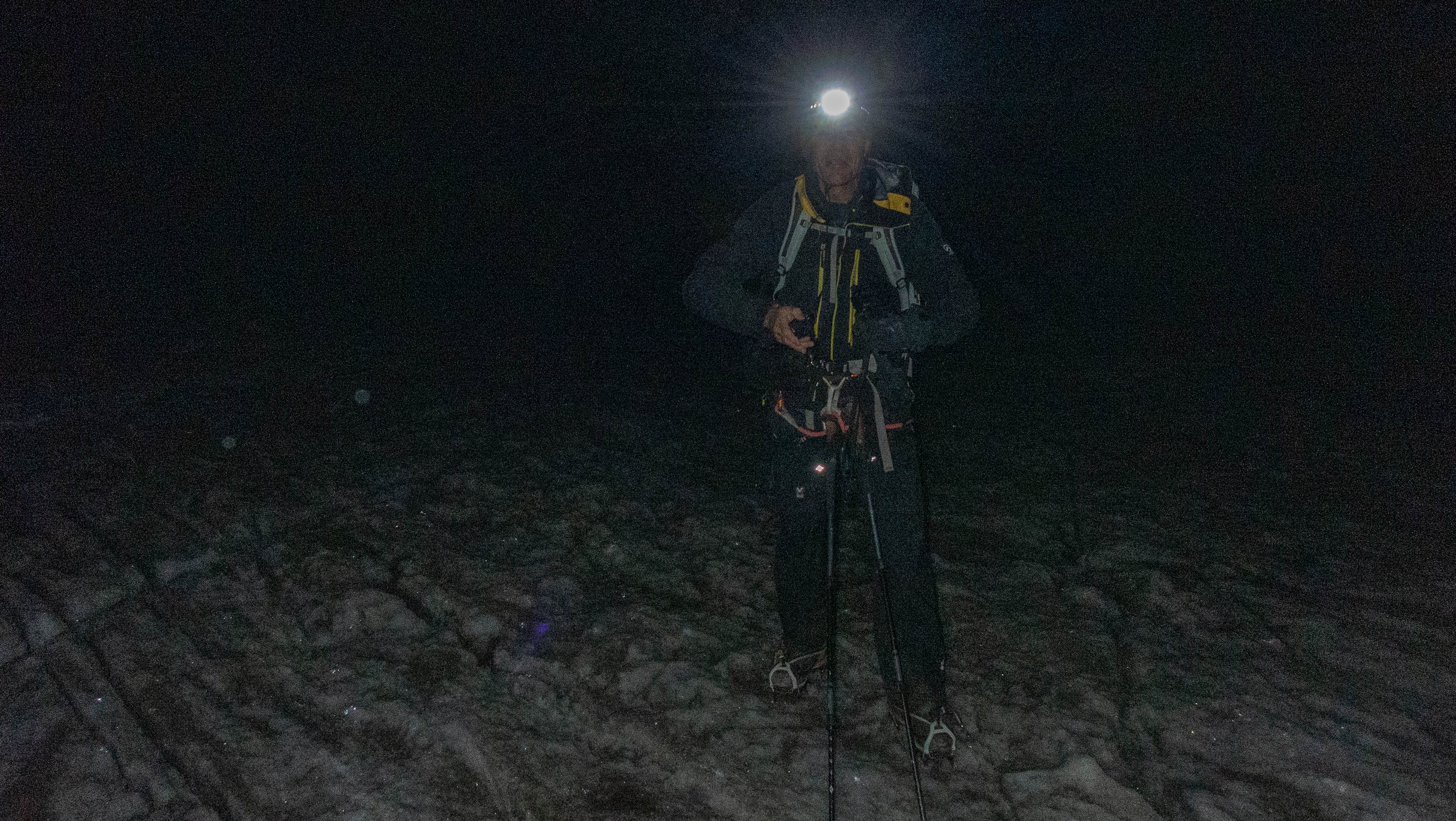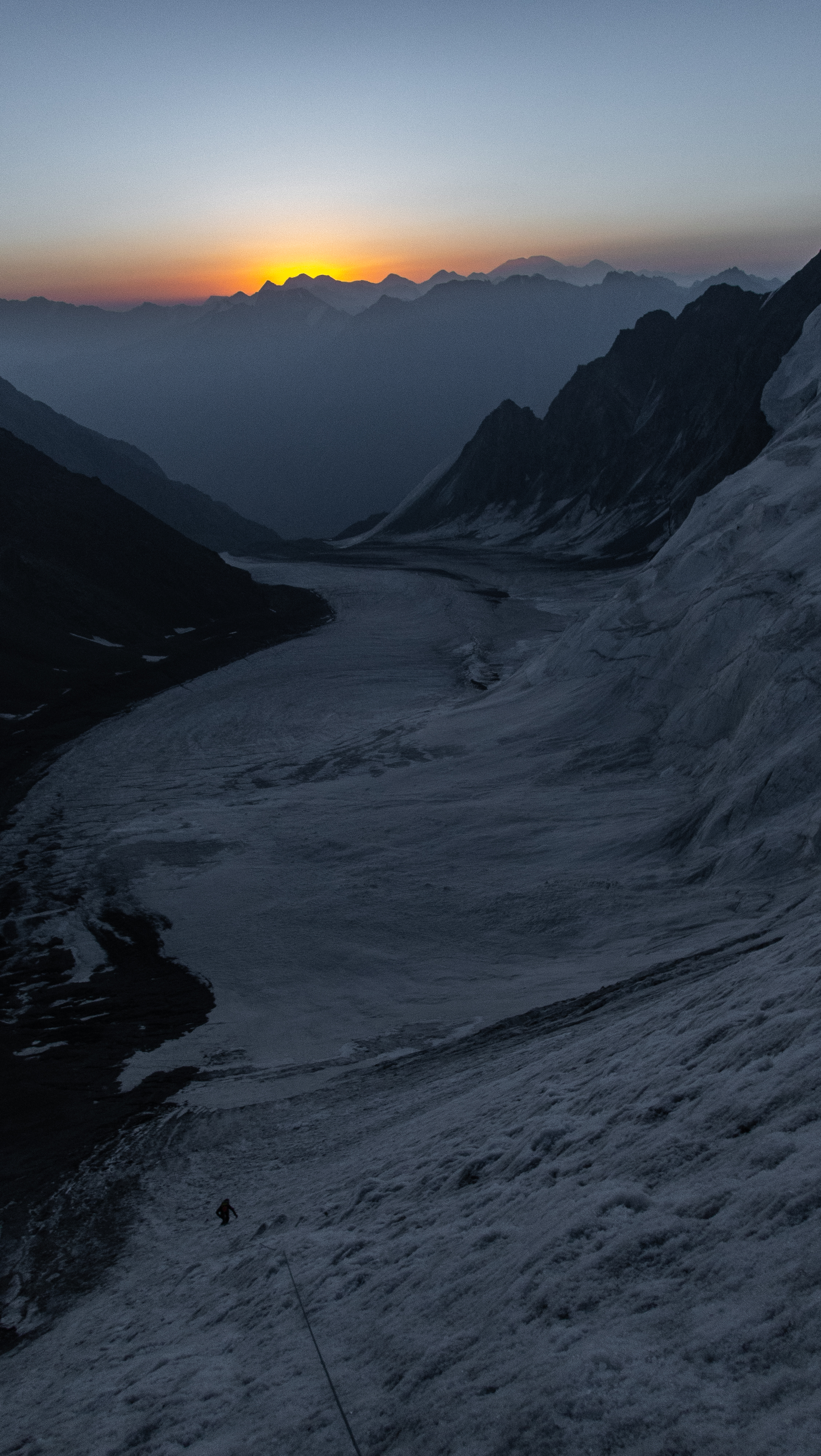 La nuit est claire, une demi-lune éclaire le glacier et les montagnes qui l'entourent. Les conditions de regel sont bonnes. Mais il ne faut pas tarder car nous n'oublions pas que l'ISO 0°C est à 6500 m, il nous faudra redescendre la face avant que le soleil ne la frappe de plein fouet, déclenchant les chutes de pierres.