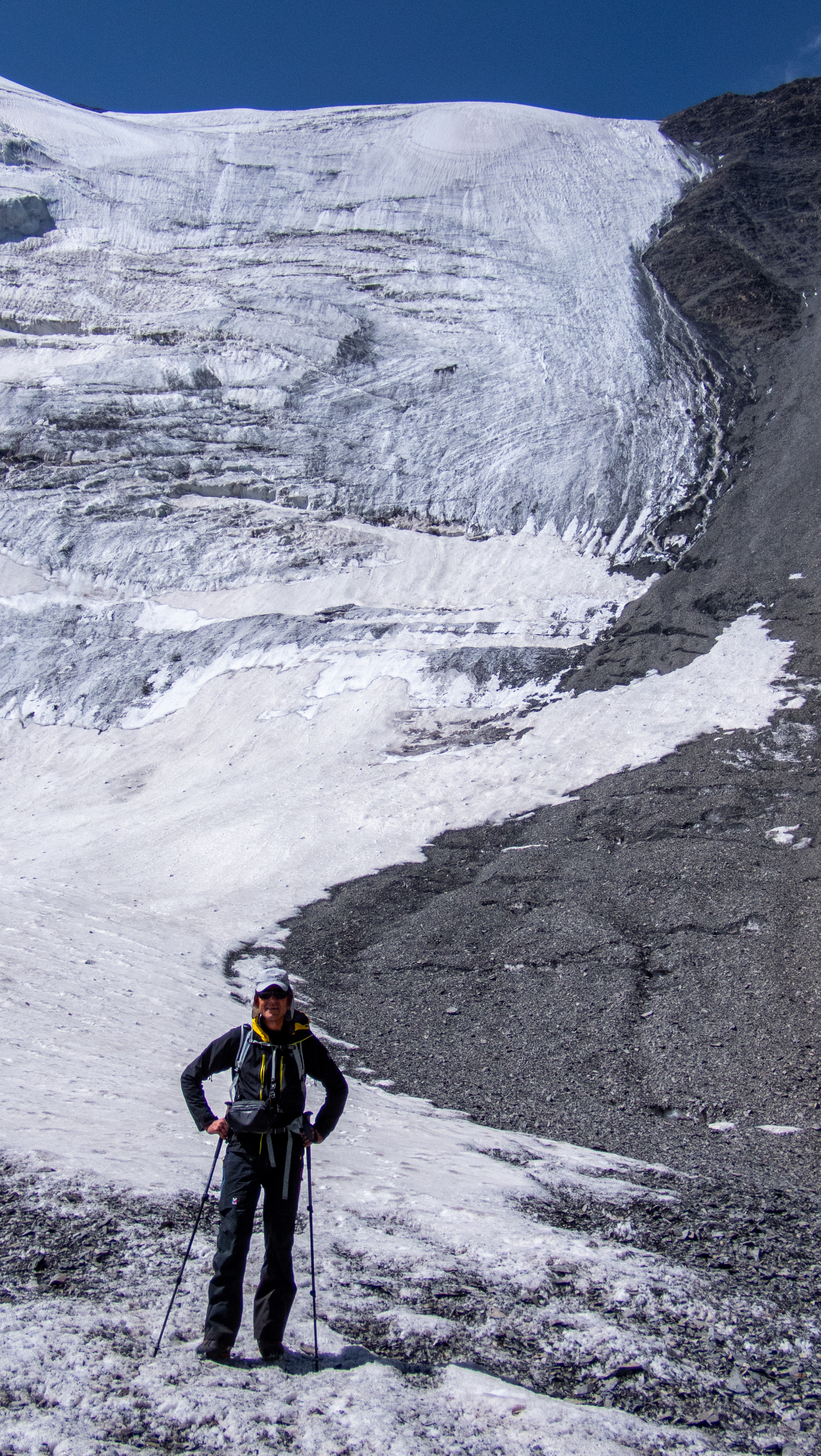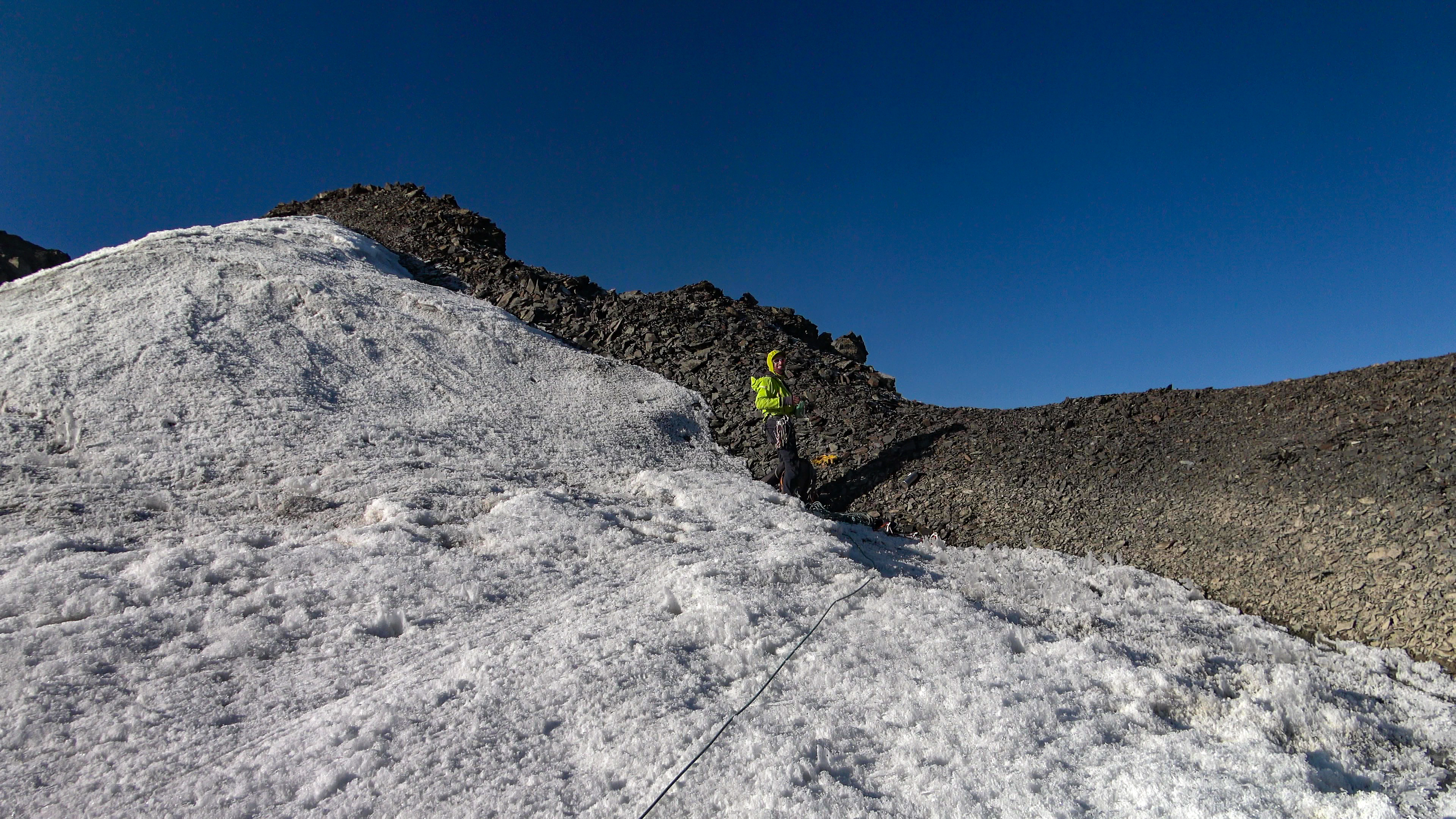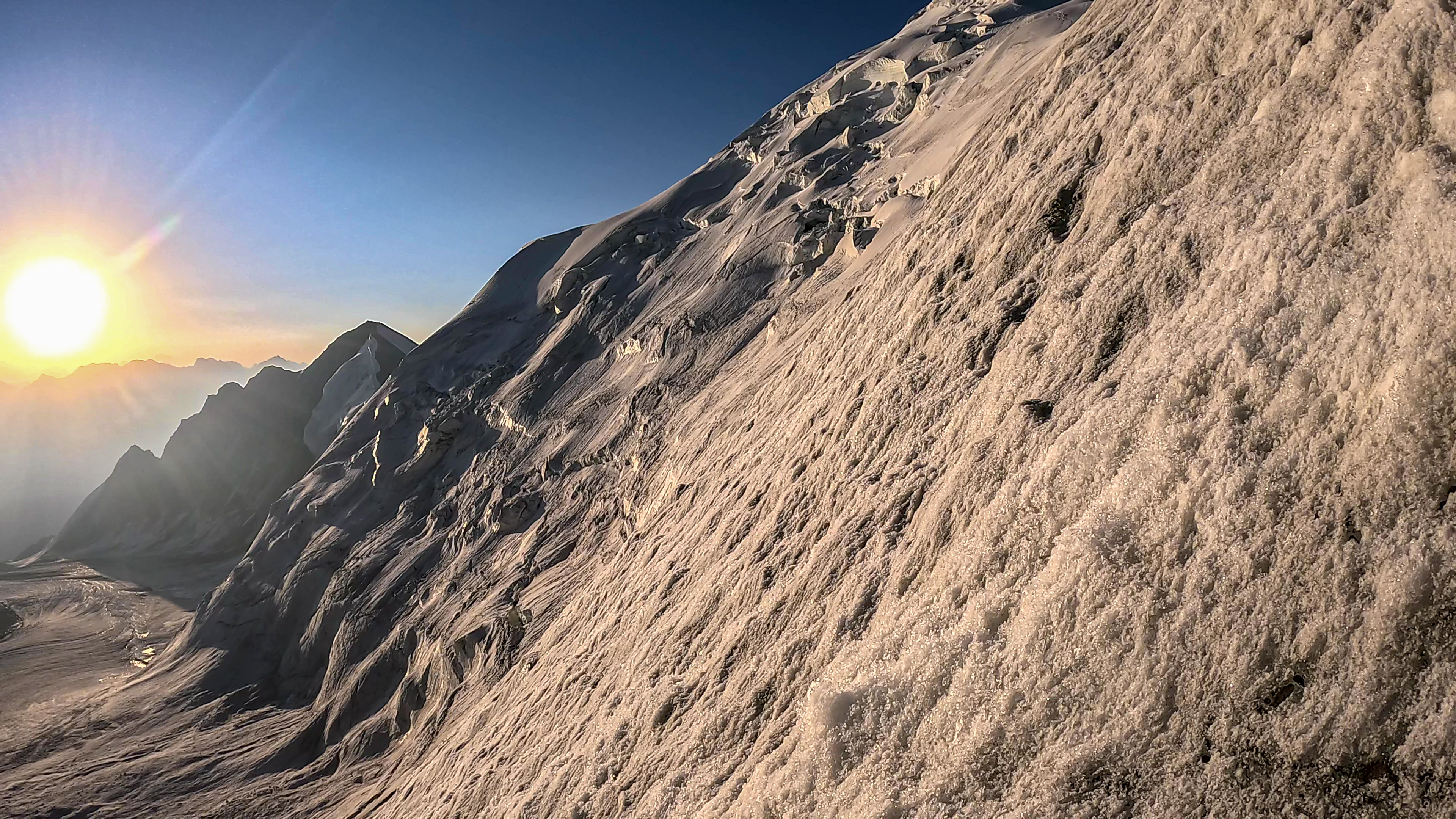 Nous redescendons dans la face, par un itinéraire situé à gauche de celui de la montée, afin d'éviter les chutes de pierres. Avec l'apparition du soleil, ces dernières se déclenchent sur le côté droit de la face, le long de la partie rocheuse de la montagne. Nous restons très vigilants et attentifs ! J'entends le bruit sifflant d'une pierre passer au dessus de ma tête.