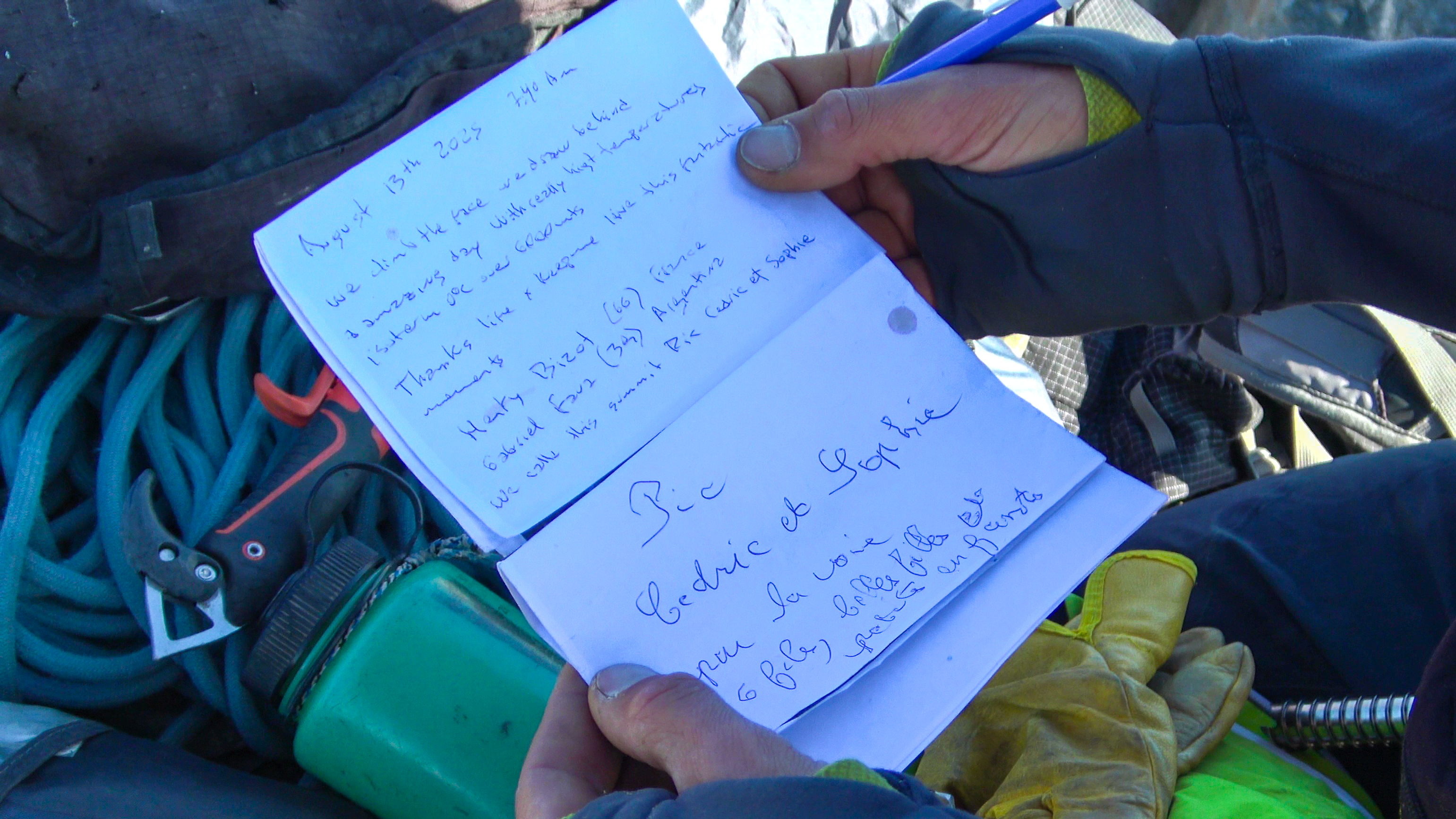 Sous un cairn que nous réalisons, nous laissons, dans un emballage plastique (de pain de mie de mémoire), un papier avec des informations sur notre ascension. Nous prenons des photos de nous-mêmes et des paysages qui nous entourent.
