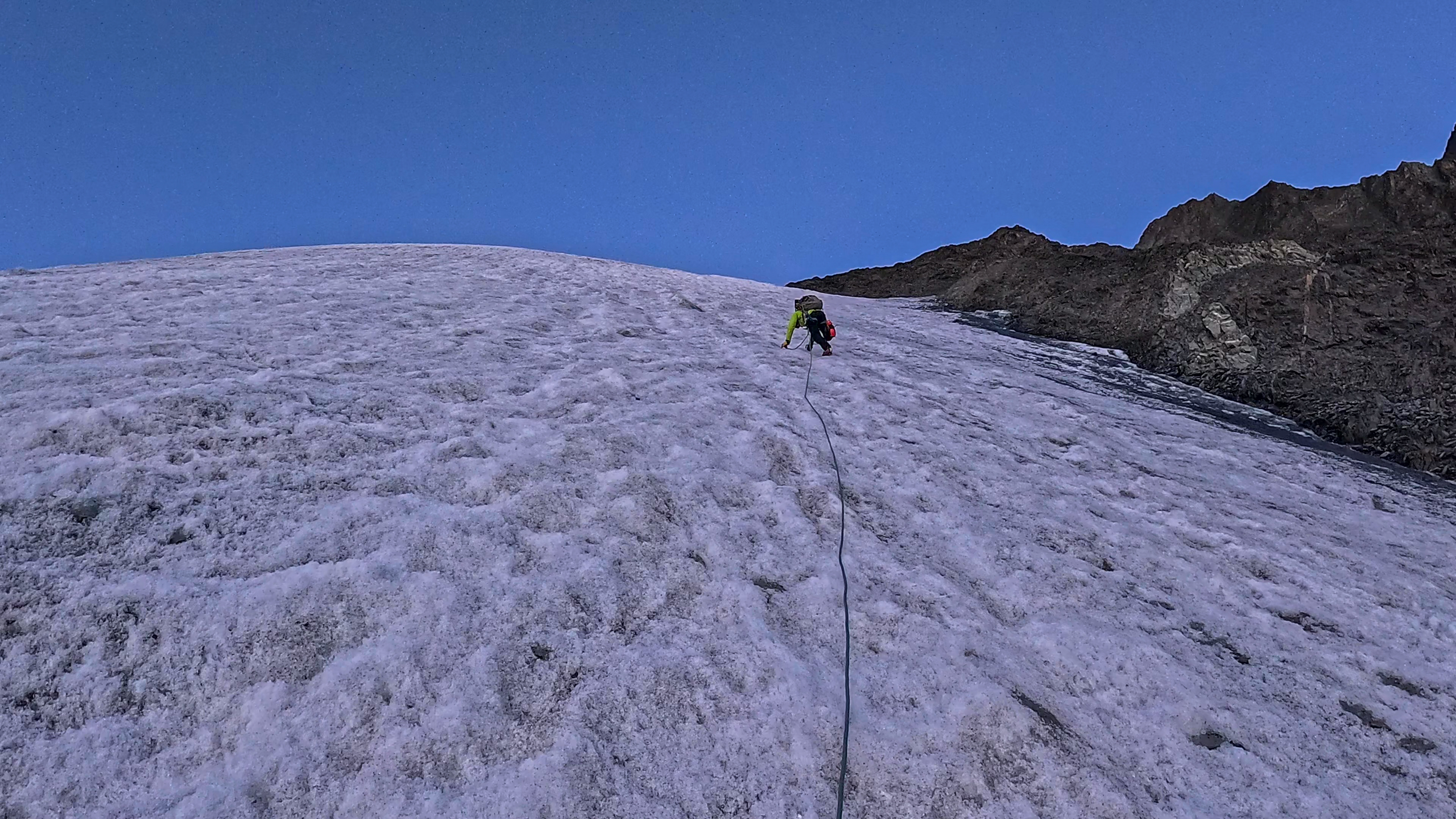 Nous la franchissons et nous nous engageons dans cette face orientée est. Elle est en glace dure et relativement bien fournie. De quoi faire travailler les mollets ! Nous longeons le côté droit de la face, à proximité du rocher qui la longe ; à la descente, il nous faudra nous déporter vers son centre, afin d'être à l'abri des chutes de pierres qui ne vont pas manquer de se déclencher avec le lever du soleil. Une frayeur avec la chute d'un bloc de glace qui vient frapper mon casque. L'inclinaison de la pente est de 45° au début et atteint 60° par la suite. La forme est bonne.