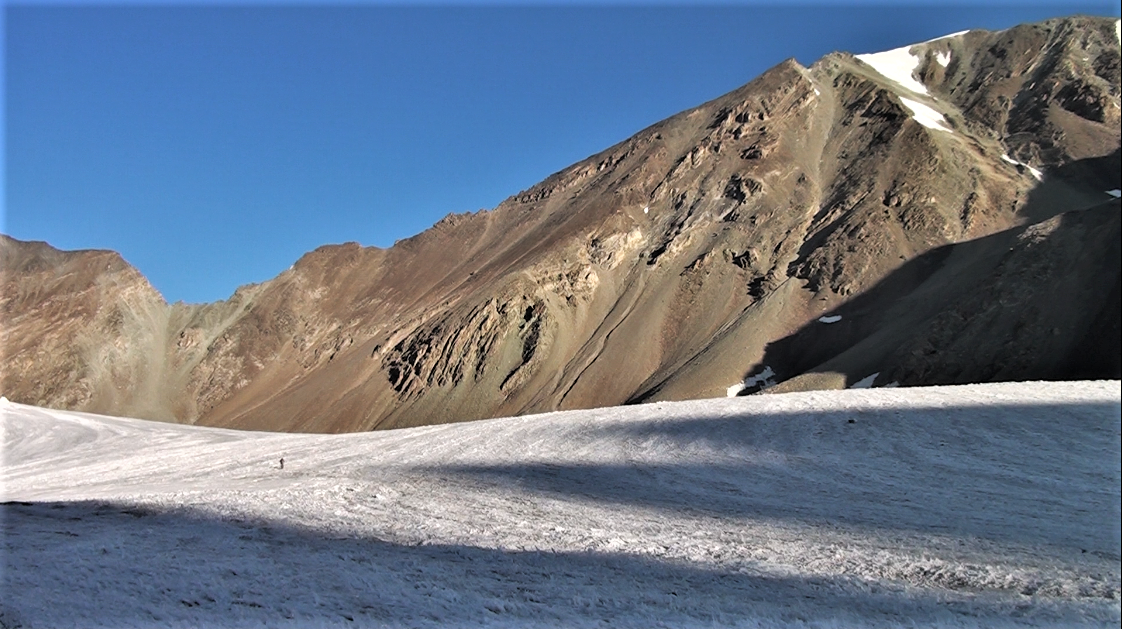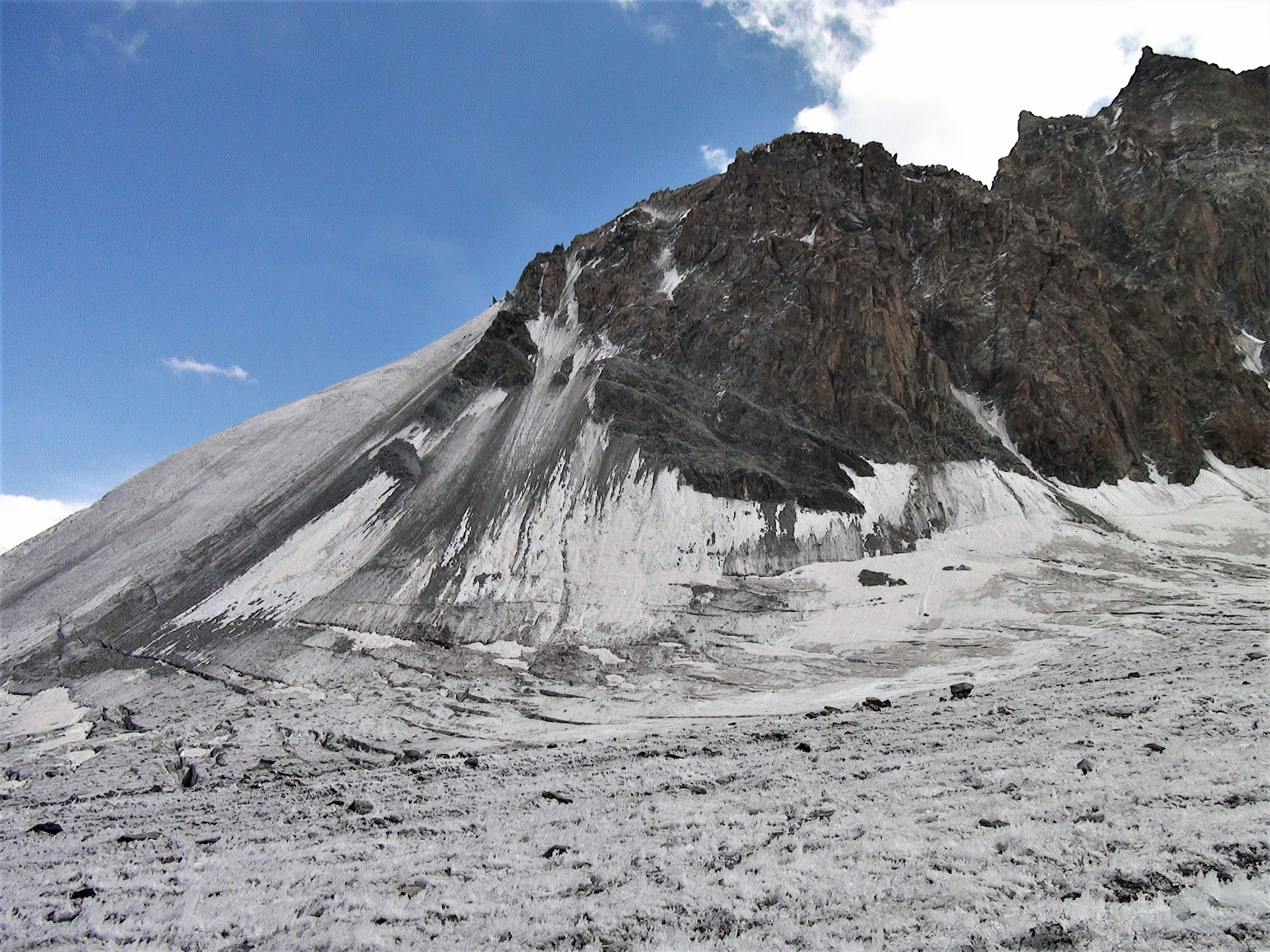 En direction de l’ouest, vers le fond du glacier. À notre droite, au sud, le sommet de 5 284 mètres. Itinéraire sur les pierriers : le couloir devant nous, puis en contrebas de la longue arête sommitale.