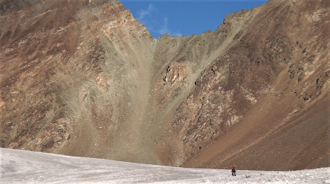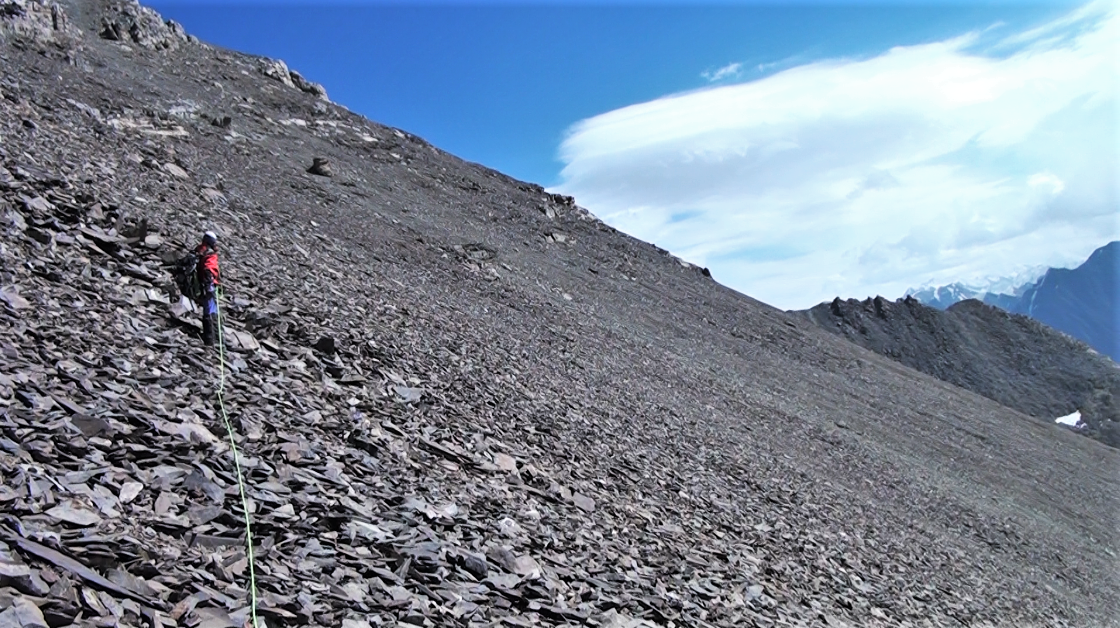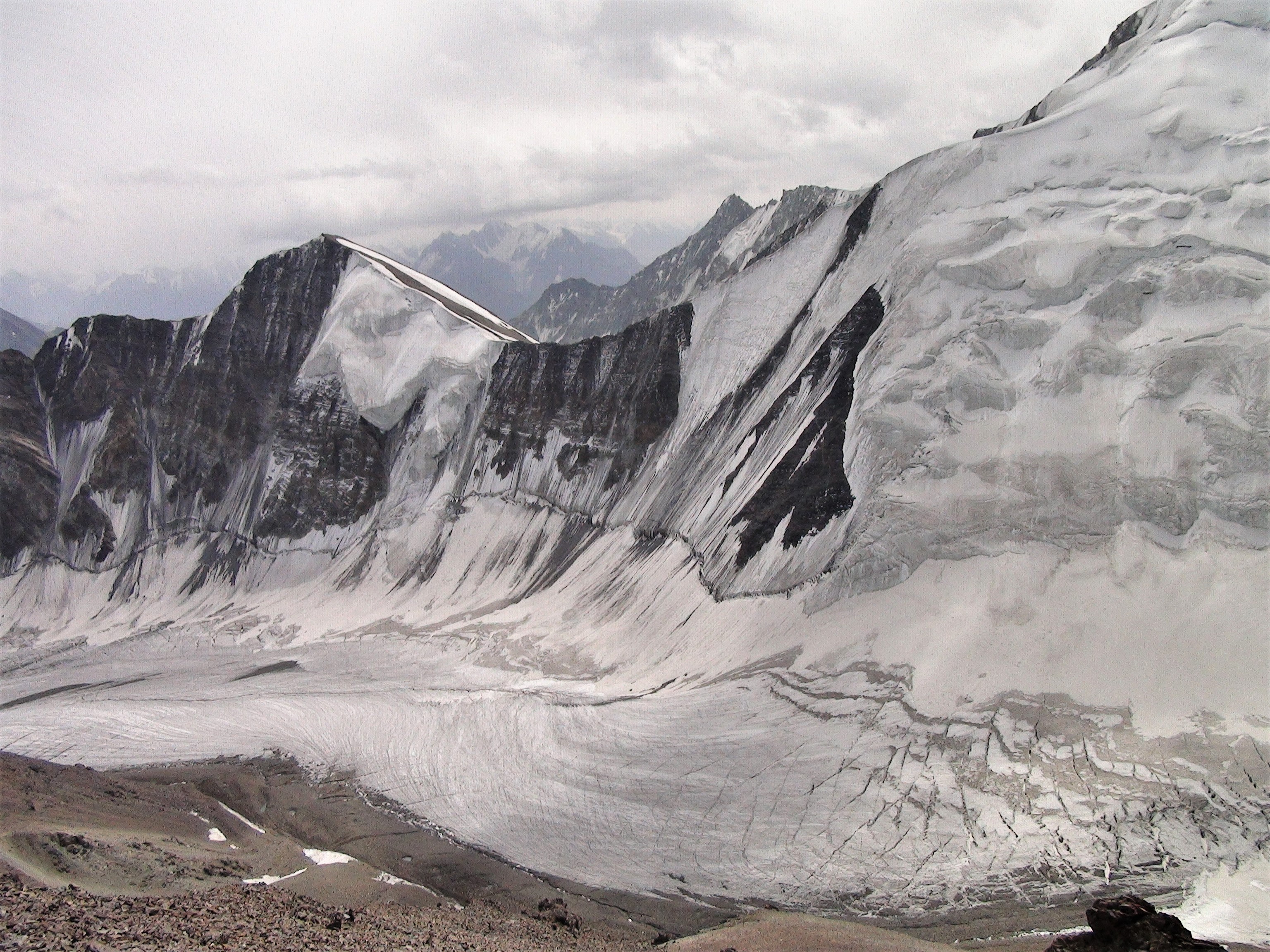 Puis nous passons quatre heures dans les pierriers, d’abord dans un couloir, puis en contrebas d’une arête. J’en bave, et je ne vois pas grand intérêt à consacrer une telle énergie à poursuivre. De plus, et cela m’importe, je ne me vois pas dédier un tel itinéraire, si froid et austère… Mais mea-culpa, j’aurais très bien pu ne pas accepter, et nous n’y serions pas allés. Finalement, à environ 5 100 mètres, après avoir pris quelques images des montagnes qui entourent le glacier, nous faisons demi-tour et redescendons au camp.