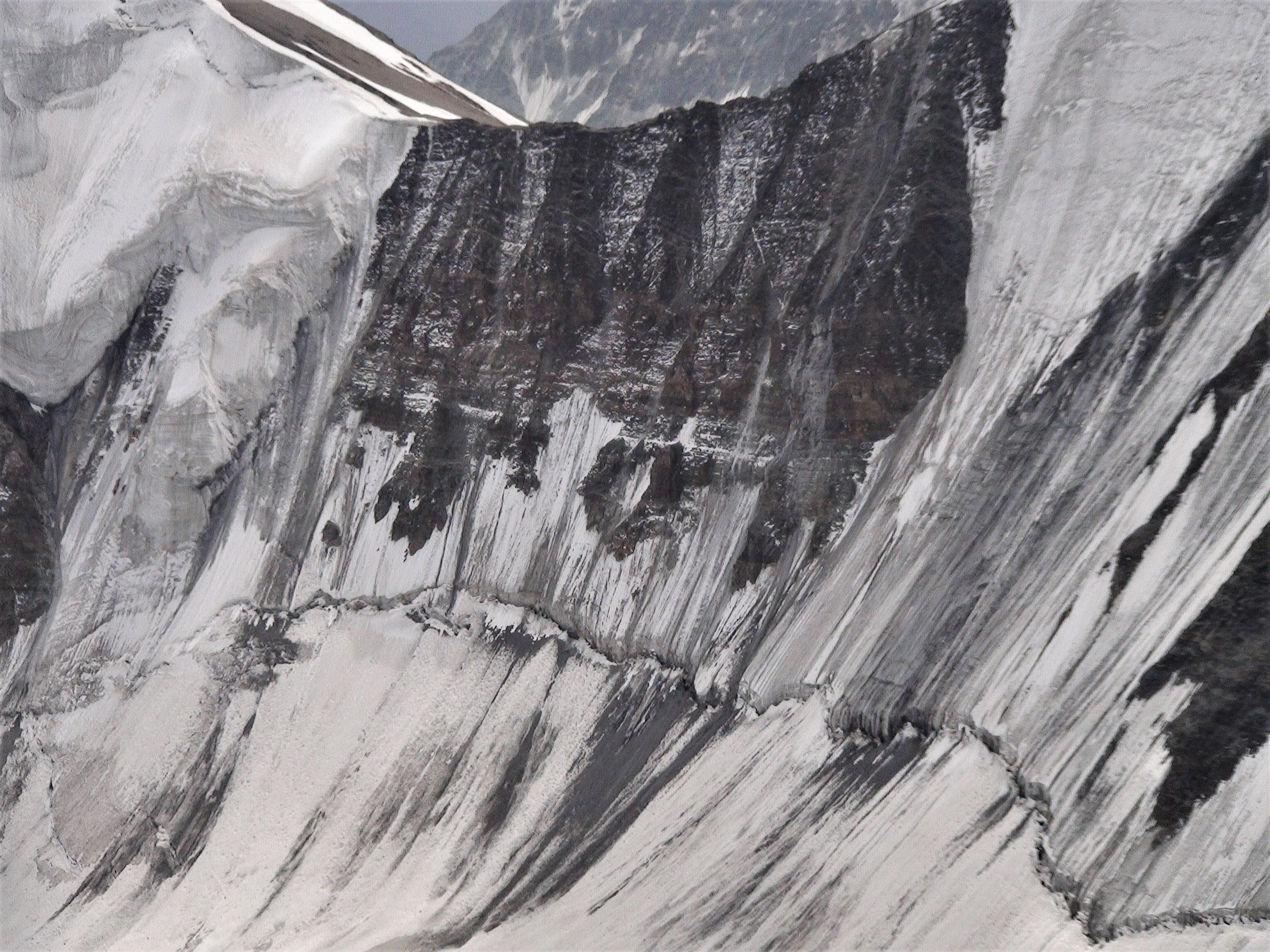 Malheureusement, les conditions sur les faces et couloirs glaciaires des montagnes paraissent particulièrement sèches. La glace y est fine et noire comme sur le sommet de 5 080 mètres, et très dure, comme sur celui de 4 782 mètres.