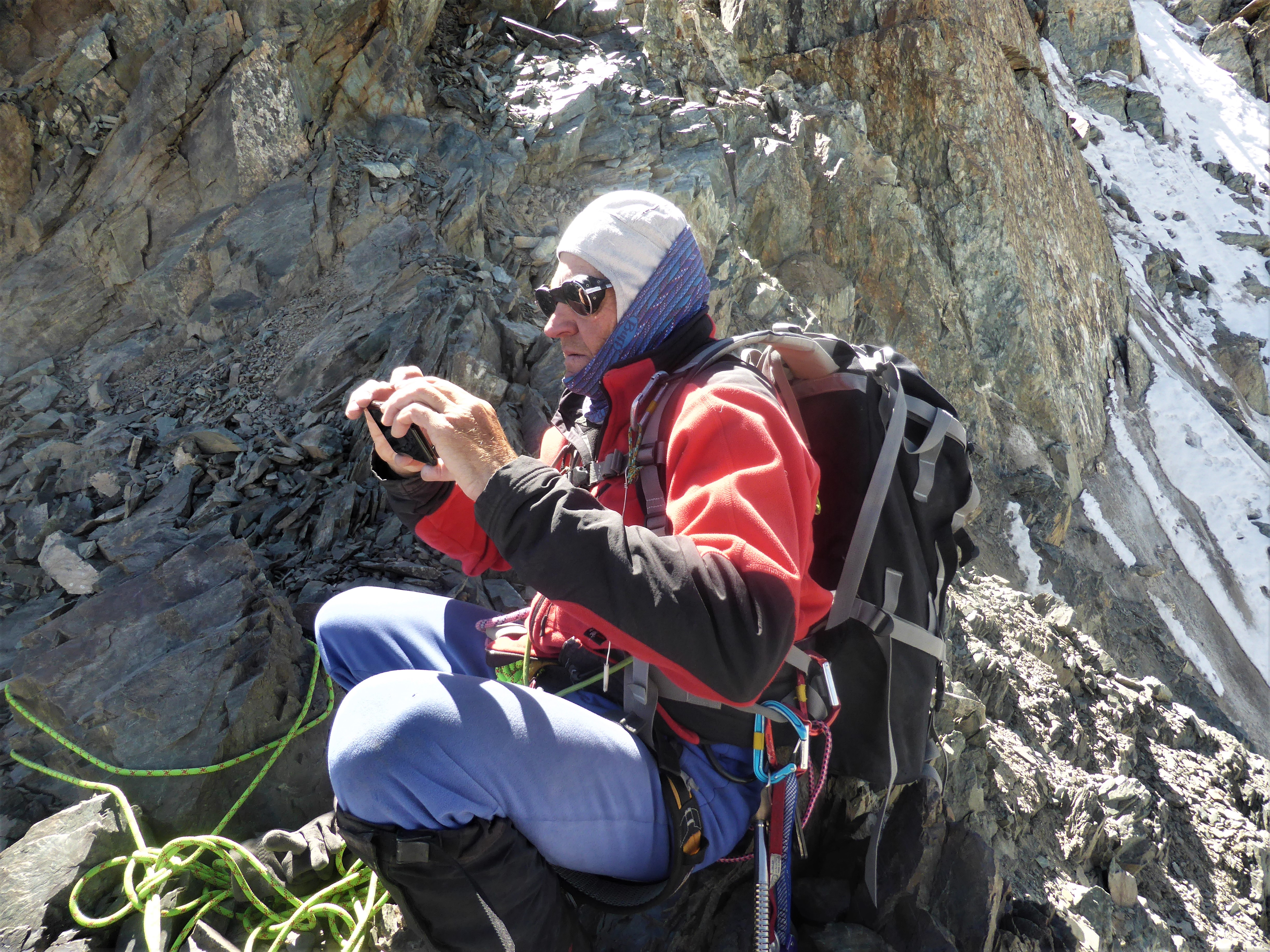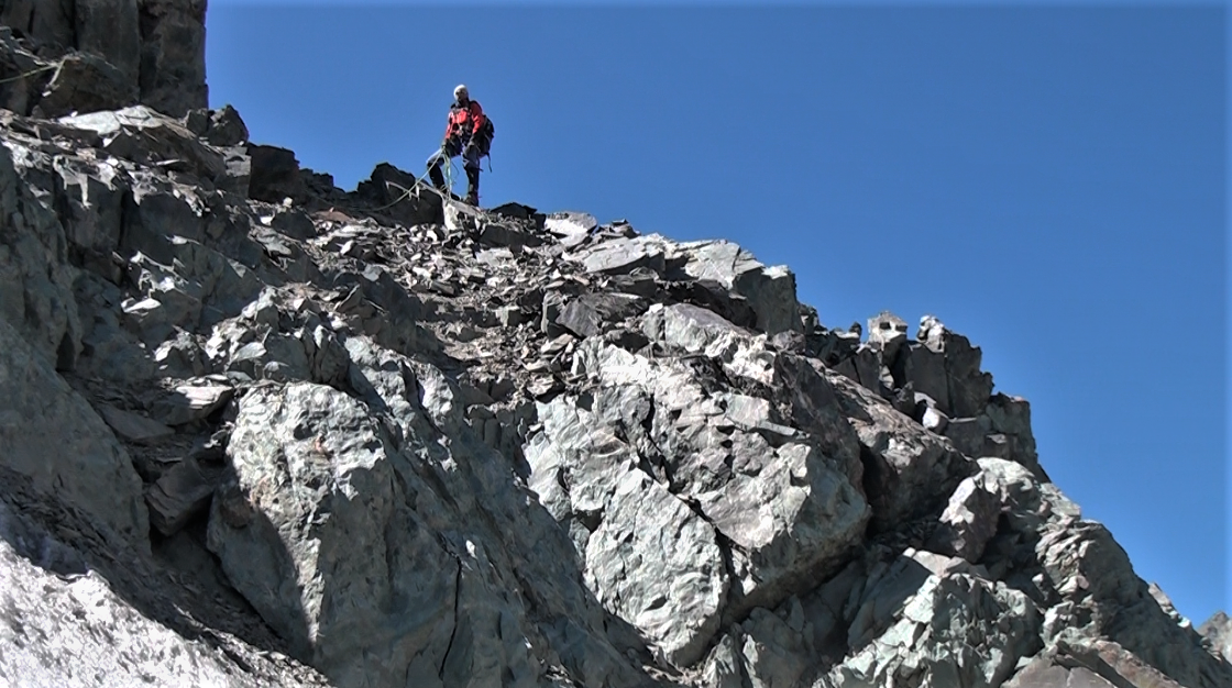 Ci-dessous photos de l’ascension réalisée sur le pic 4 782 mètres (arrêt sur l’arête rocheuse sommitale). Voie Espérance sur le Ppc Espérance.