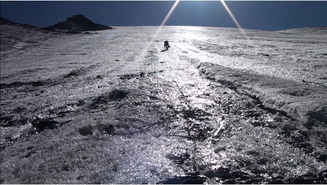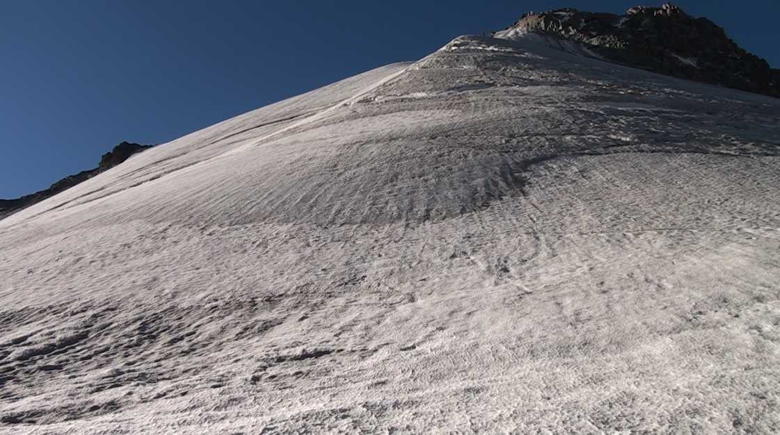 Cinq heures après avoir quitté le pied de la face, nous atteignons le haut de la partie glaciaire. Nous remontons alors un pierrier délicat, où il faut être vigilant, et atteignons l'extrémité nord de l'arête rocheuse sommitale, à une cinquantaine de mètres de son point culminant. L'accès à ce dernier ne nous inspire pas, rocailleux avec des petites tours rocheuses à grimper ou à contourner. Nous décidons de nous arrêter à ce point situé au nord de l'arête sommitale.