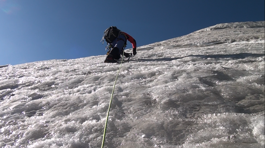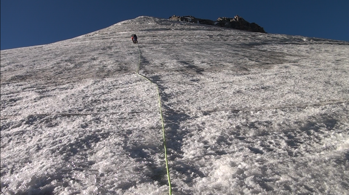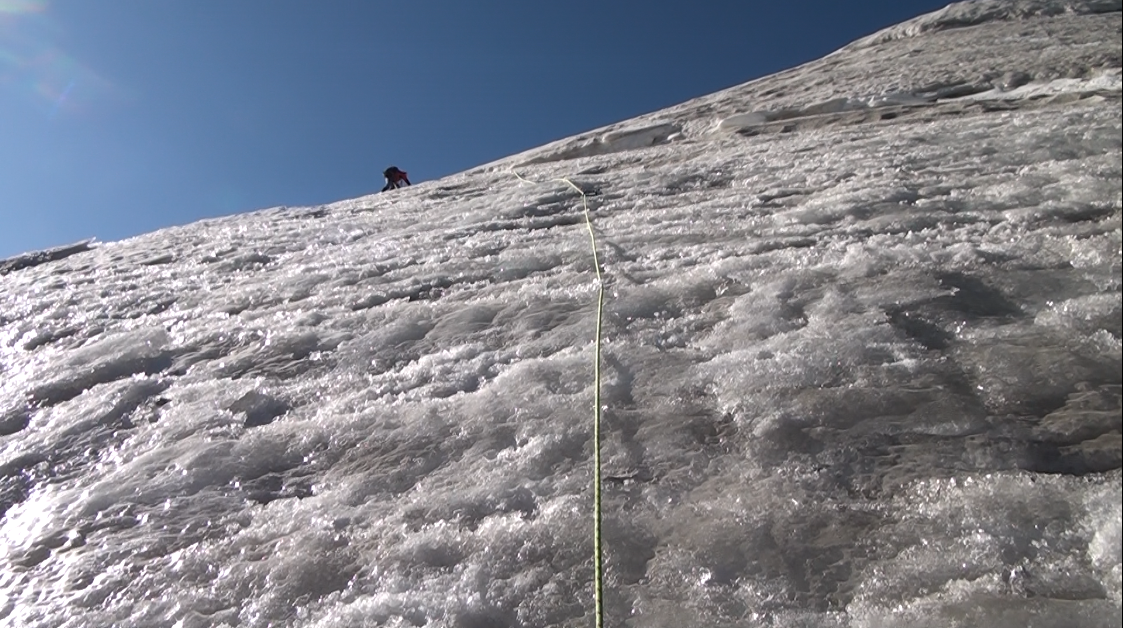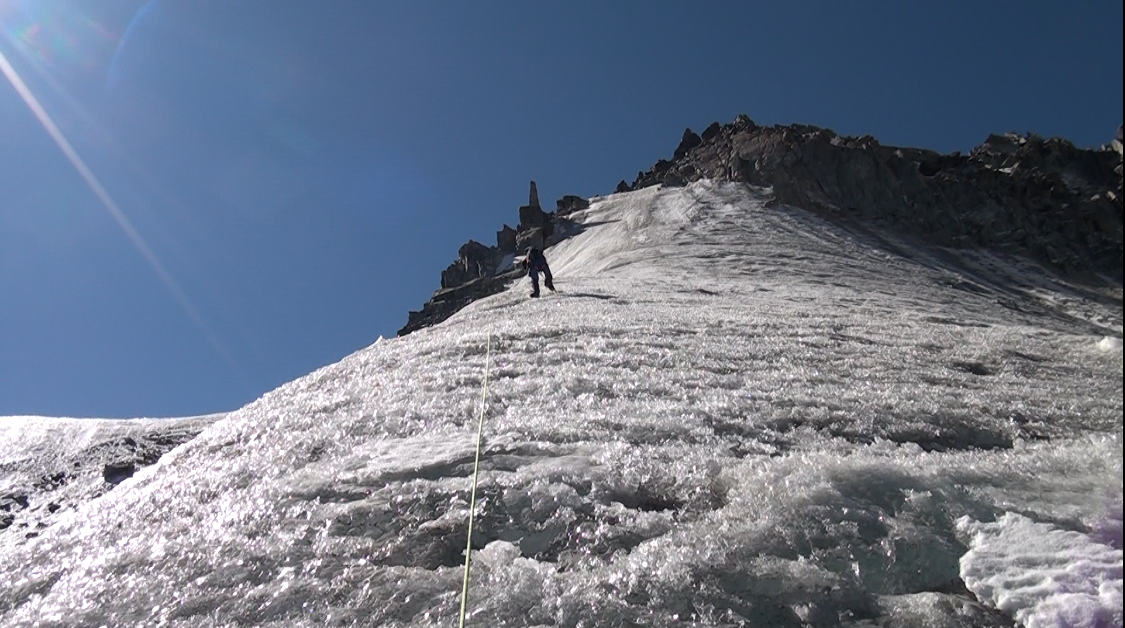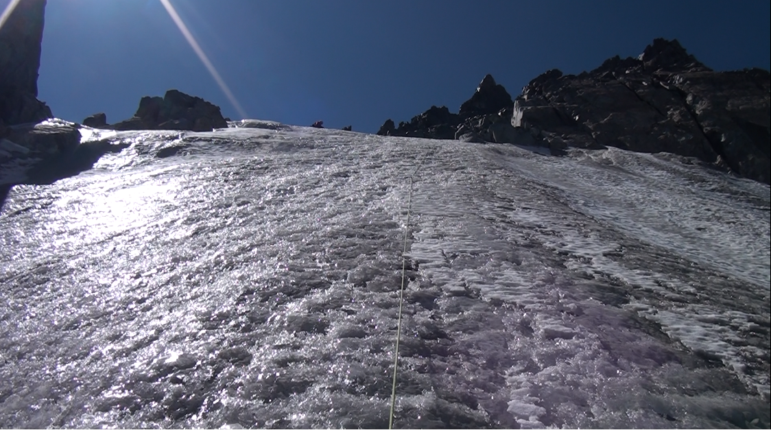 Nous nous engageons sur cette crête. Nous enchaînons les longueurs de corde, traversons au moins une rimaye, et grimpons sur des pentes inclinées jusqu'à 60° en glace dure.