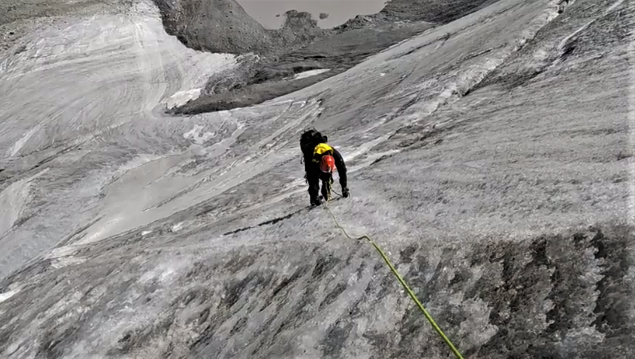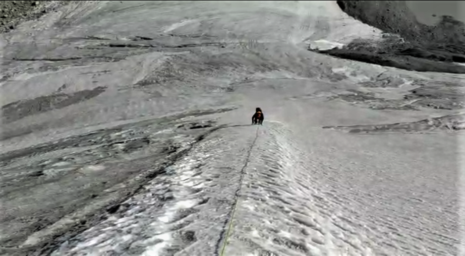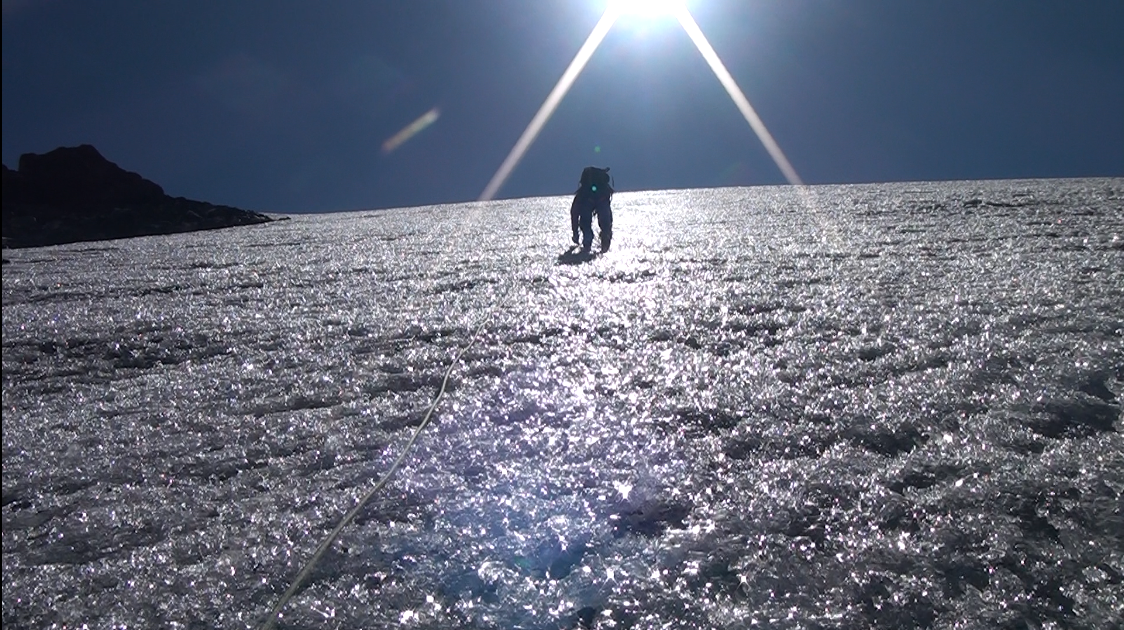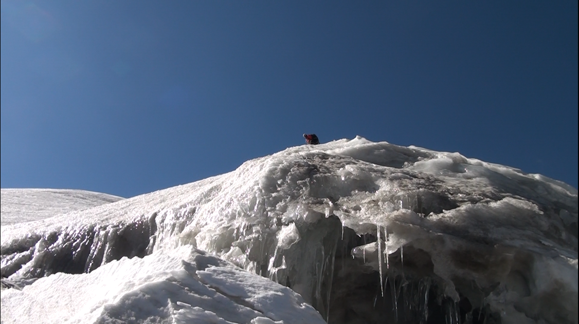Nous nous engageons sur cette crête. Nous enchaînons les longueurs de corde, traversons au moins une rimaye, et grimpons sur des pentes inclinées jusqu'à 60° en glace dure.