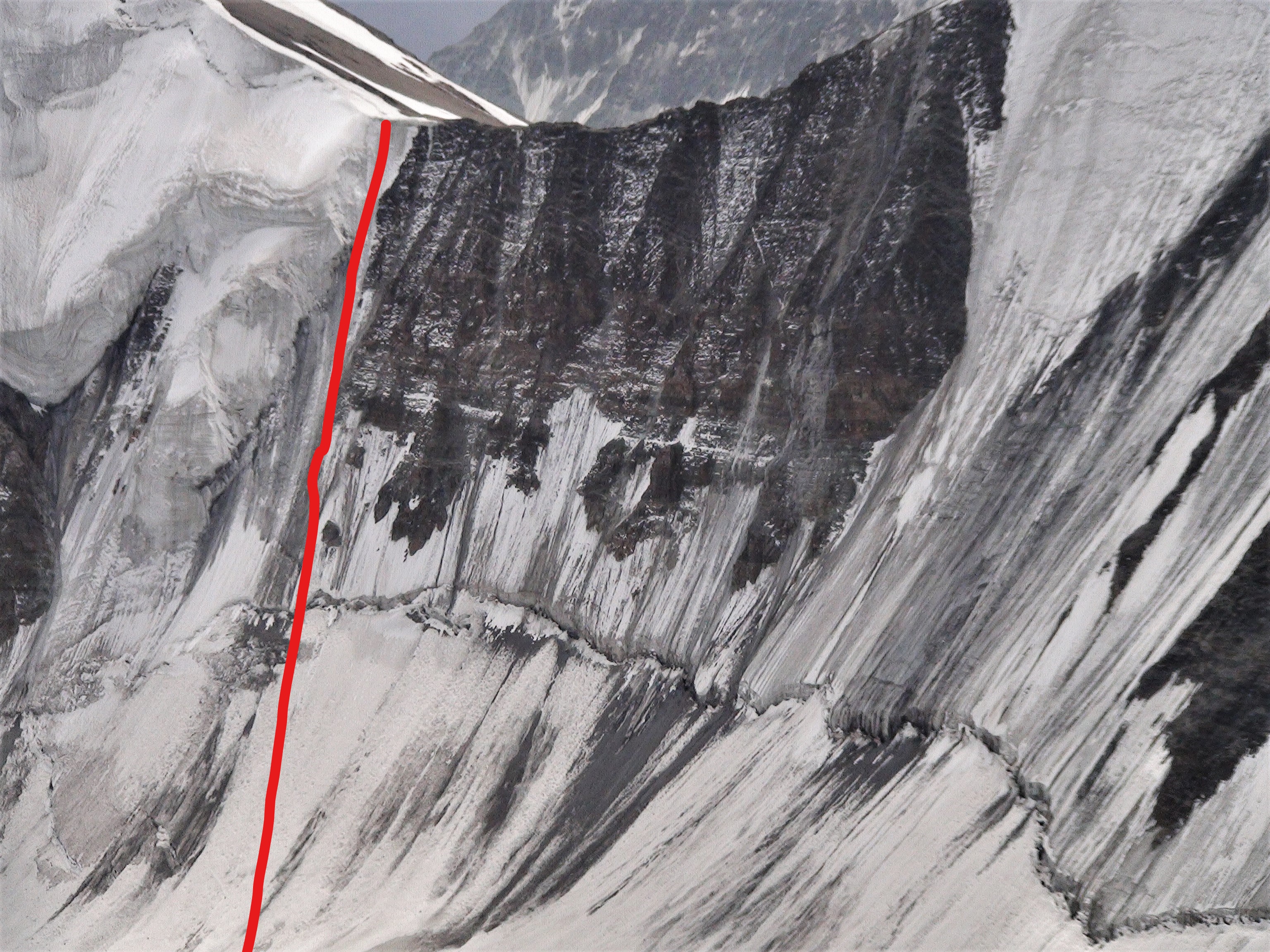 Ce que l’on prévoyait comme itinéraire d’accès à l’arête du sommet 5 080 mètres.