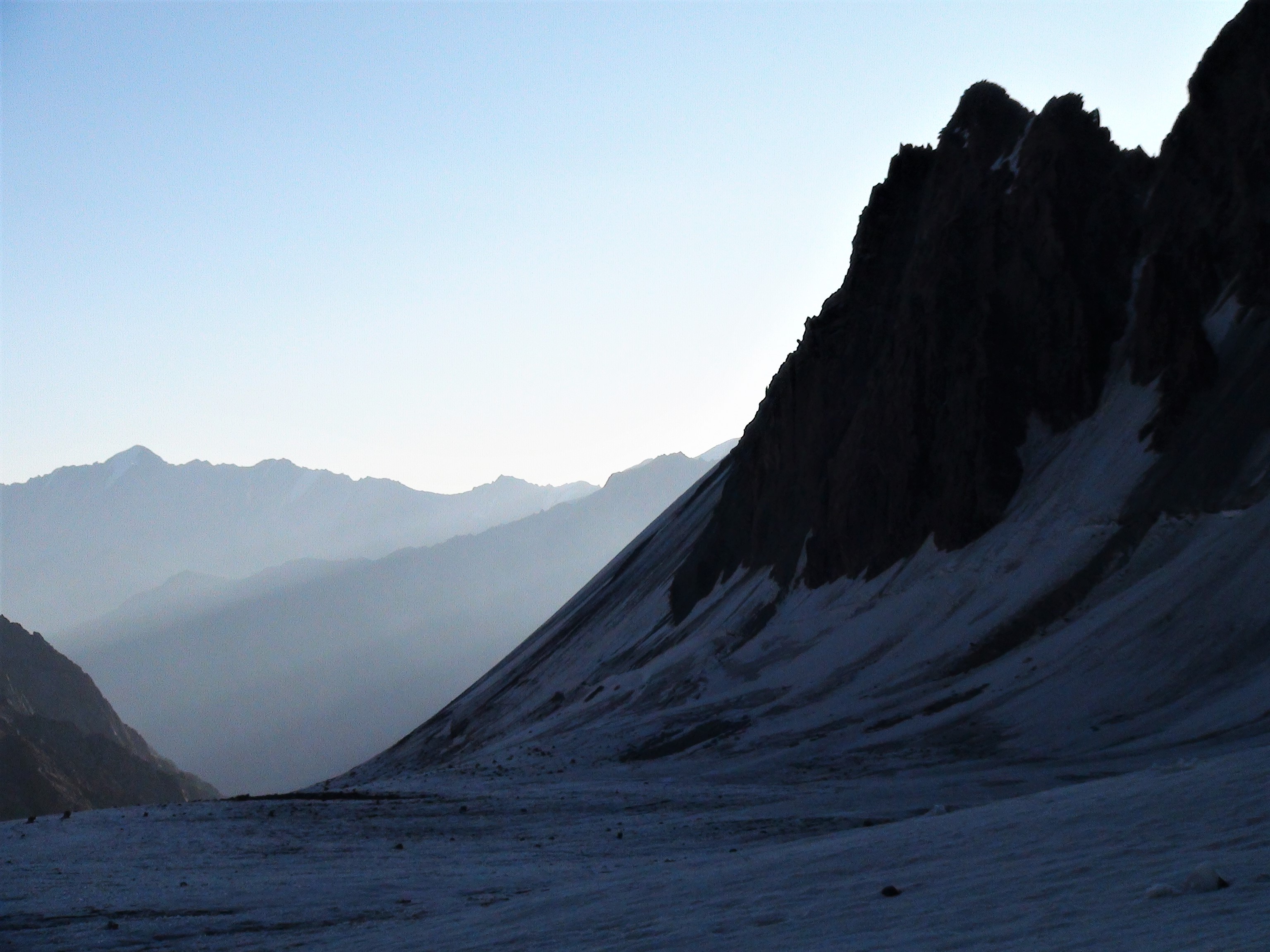 Nous parvenons, après 1,5 kilomètres sur 200 mètres de dénivelée, au pied d'un couloir en glace. Ce couloir mène à l'arête sommitale glaciaire du sommet 5 080 mètres.