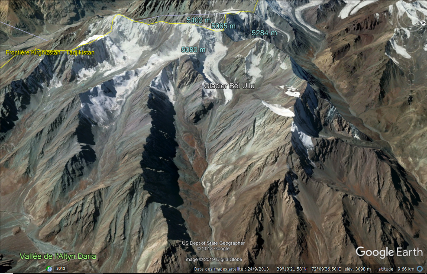 En 2019, j’étais allé dans la partie ouest de la chaîne Trans Alaï, une zone « quasi incognita », definie ainsi par Vladimir Komissarov, qui regorge de sommets vierges. Avec Nikolaï, nous avions choisi une vallée secondaire de la vallée Altyn Daria, appelée Bel Uluu, très peu explorée, et qui débouche sur un glacier qui n’avait jamais été foulé auparavant. Cette vallée Altyn Daria, je l’avais découverte dans un récit de 1960, Nos amies les cimes de Jean Vernet. Et j’avais pu obtenir des informations actualisées grâce à l’excellent Guide de l’alpinisme au Kirghizstan de Vladimir Komissarov, très complet et précis.