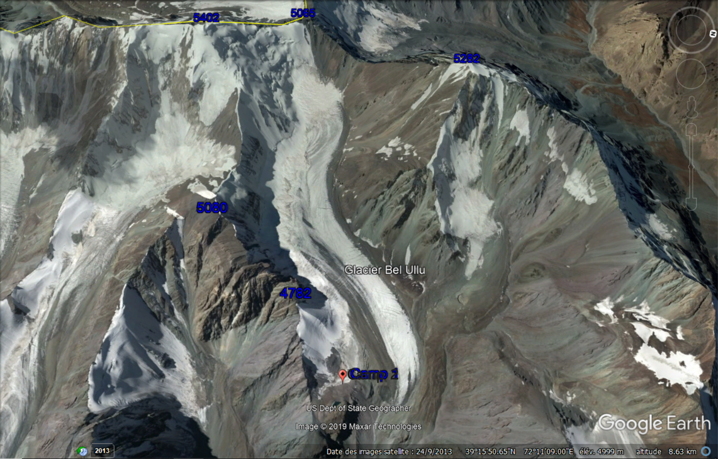 En 2019, nous avions foulé ce glacier Bel Uluu, pas d’exploration préalable connue. Malgré des conditions glaciaires très sèches et dangereuses sur les montagnes qui dominent le glacier, nous avions pu réaliser l’ascension d’une très belle face glaciaire à 4 800 mètres, et avions dédié cet itinéraire à Espérance, en le baptisant La voie Espérance. Voir : Carnet d'expédition 2019