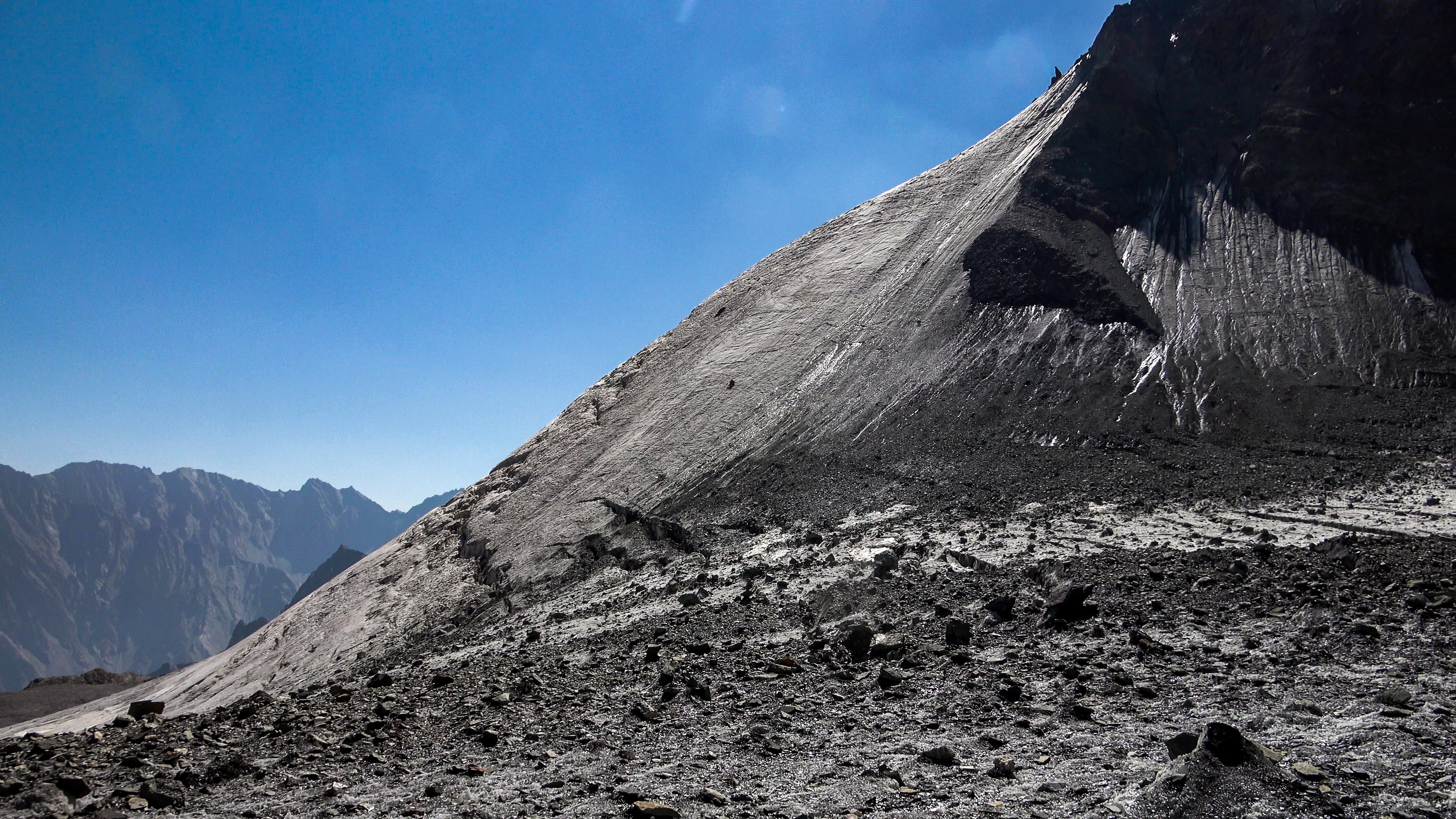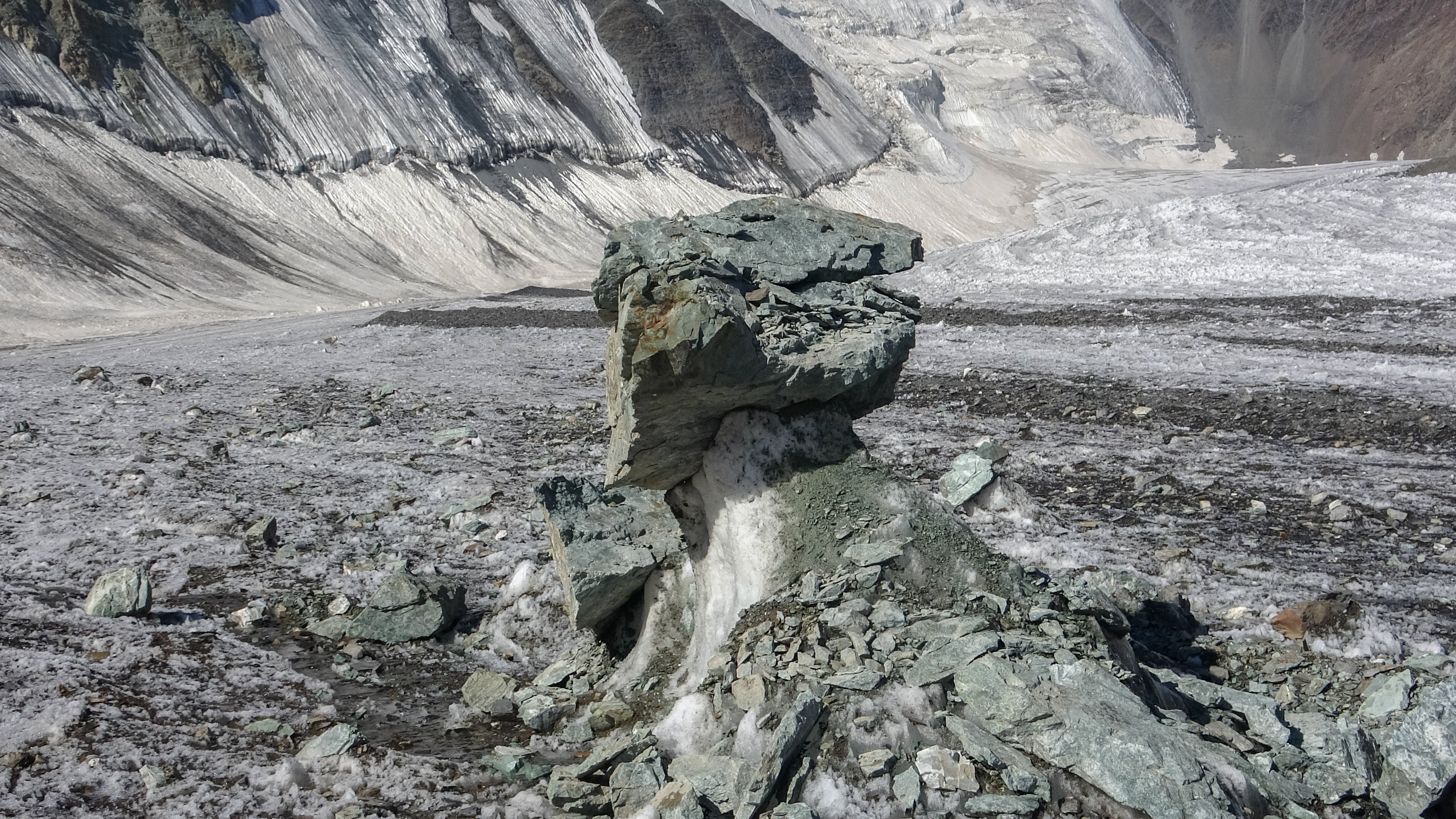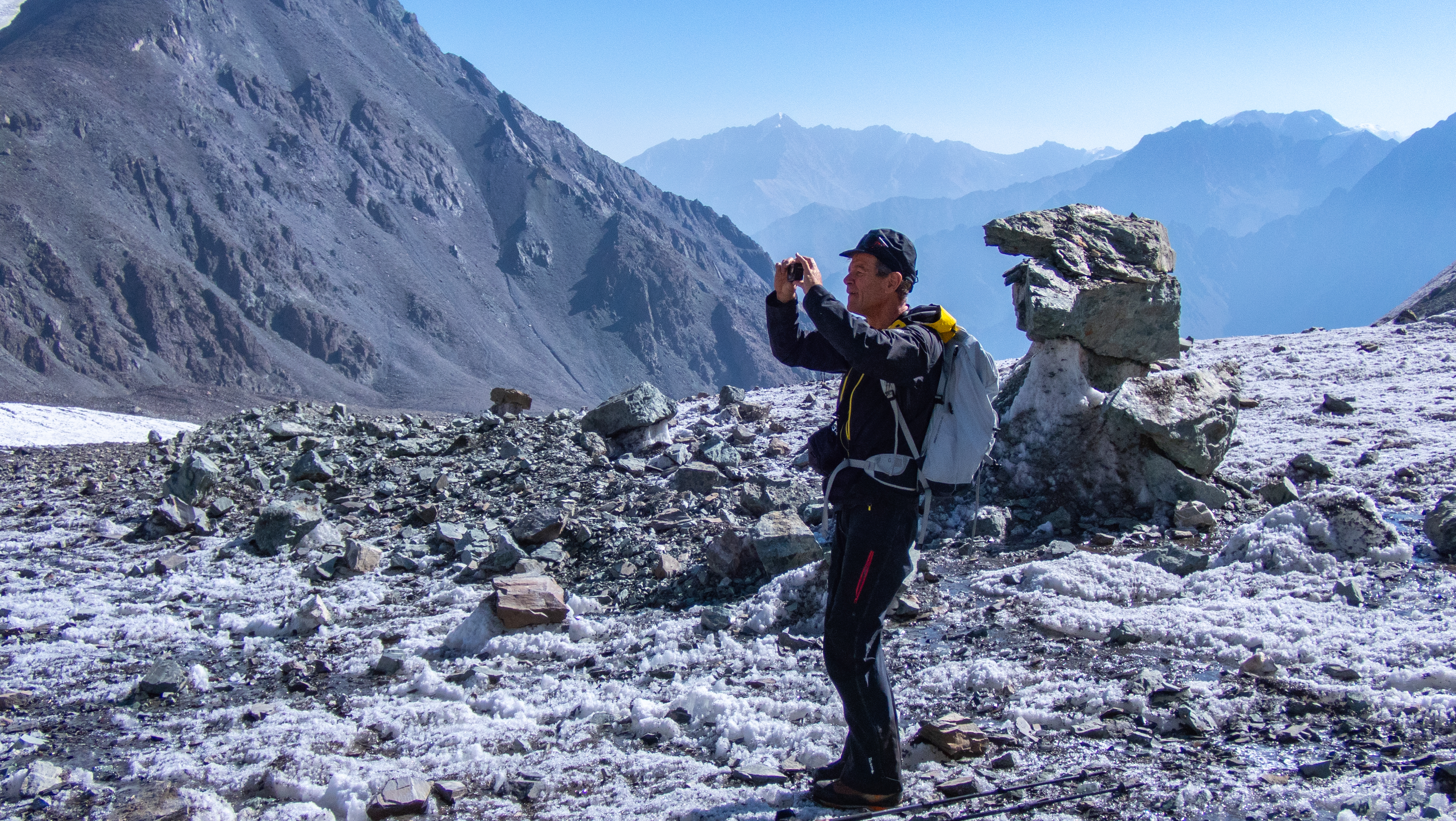 - Le sommet coté 5284 m sur notre carte Google Earth, situé au nord du glacier, est un véritable tas de cailloux. En 2019, avec Nikolaï, nous étions montés jusqu'à 100 à 200 m du sommet pour nous acclimater. Une montée horrible, sans aucun intérêt, hormis de nous faire perdre beaucoup d'énergie.