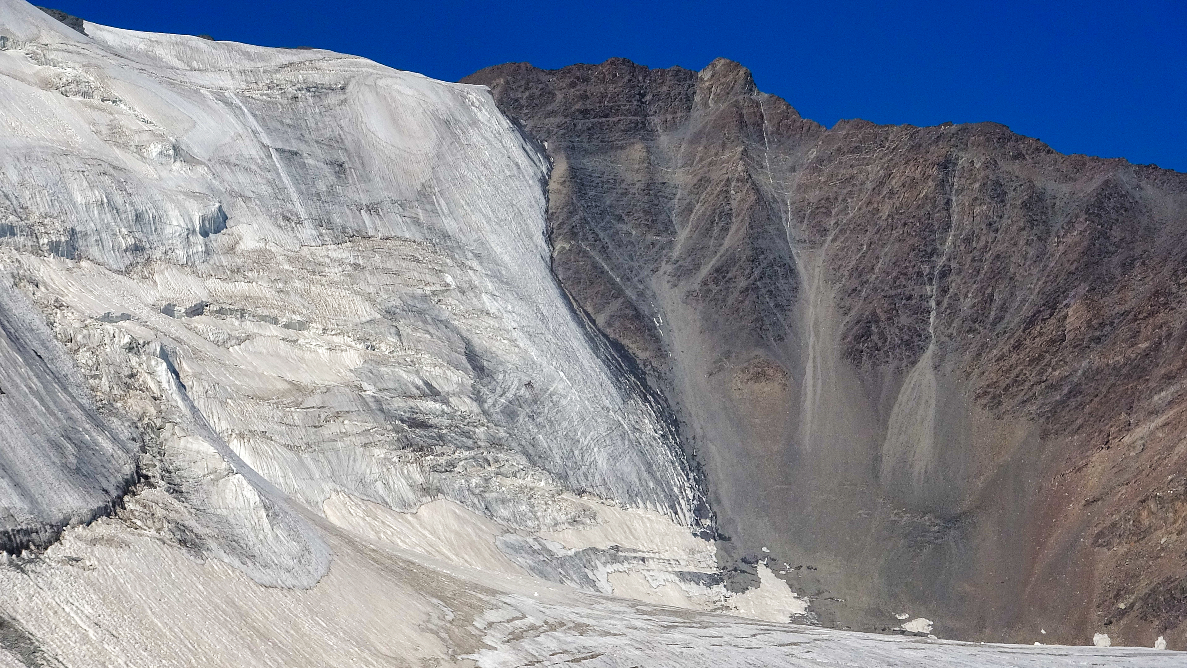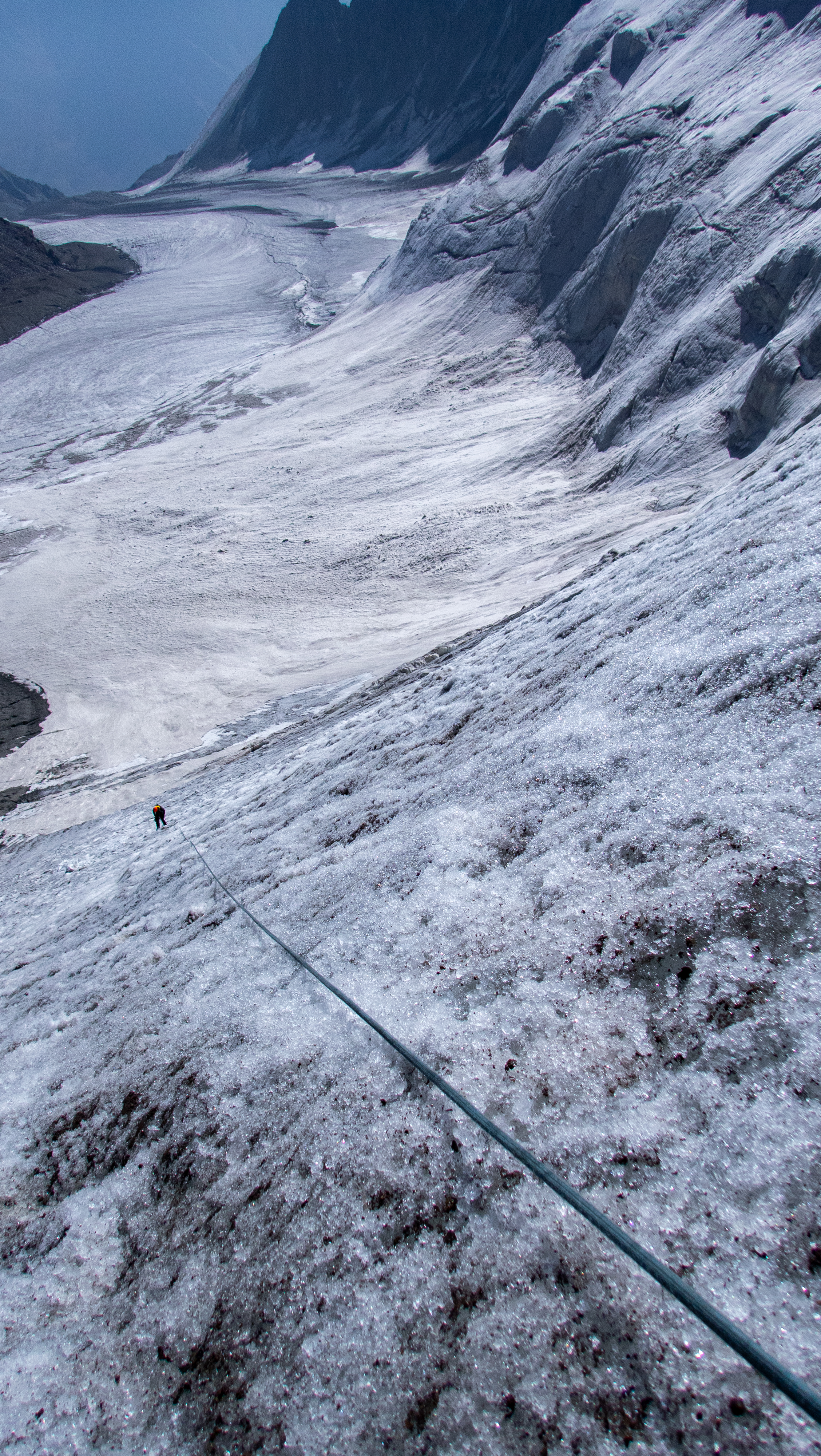 Nous redescendons dans la face, par un itinéraire situé à gauche de celui de la montée, afin d'éviter les chutes de pierres. Avec l'apparition du soleil, ces dernières se déclenchent sur le côté droit de la face, le long de la partie rocheuse de la montagne. Nous restons très vigilants et attentifs ! J'entends le bruit sifflant d'une pierre passer au dessus de ma tête.