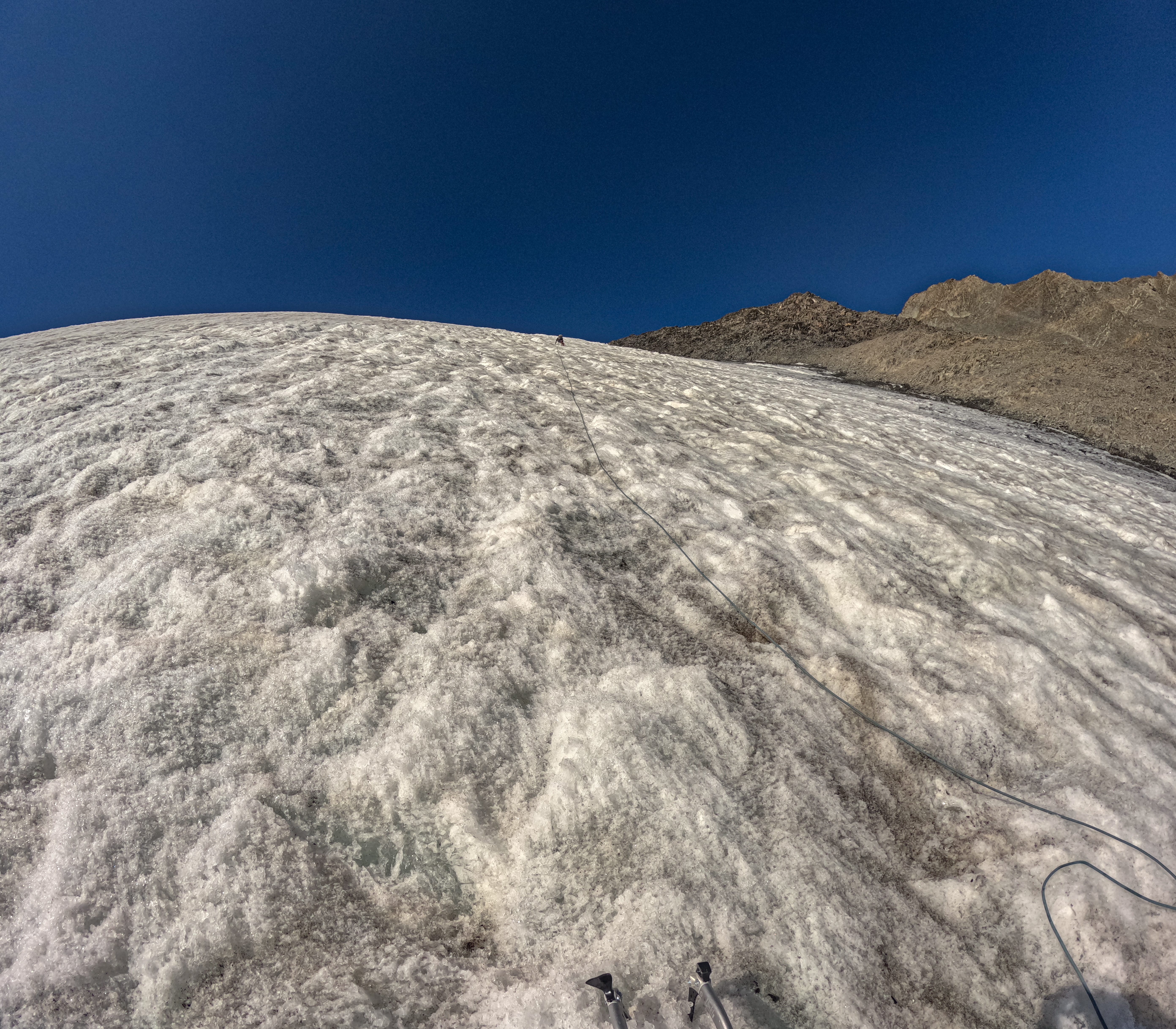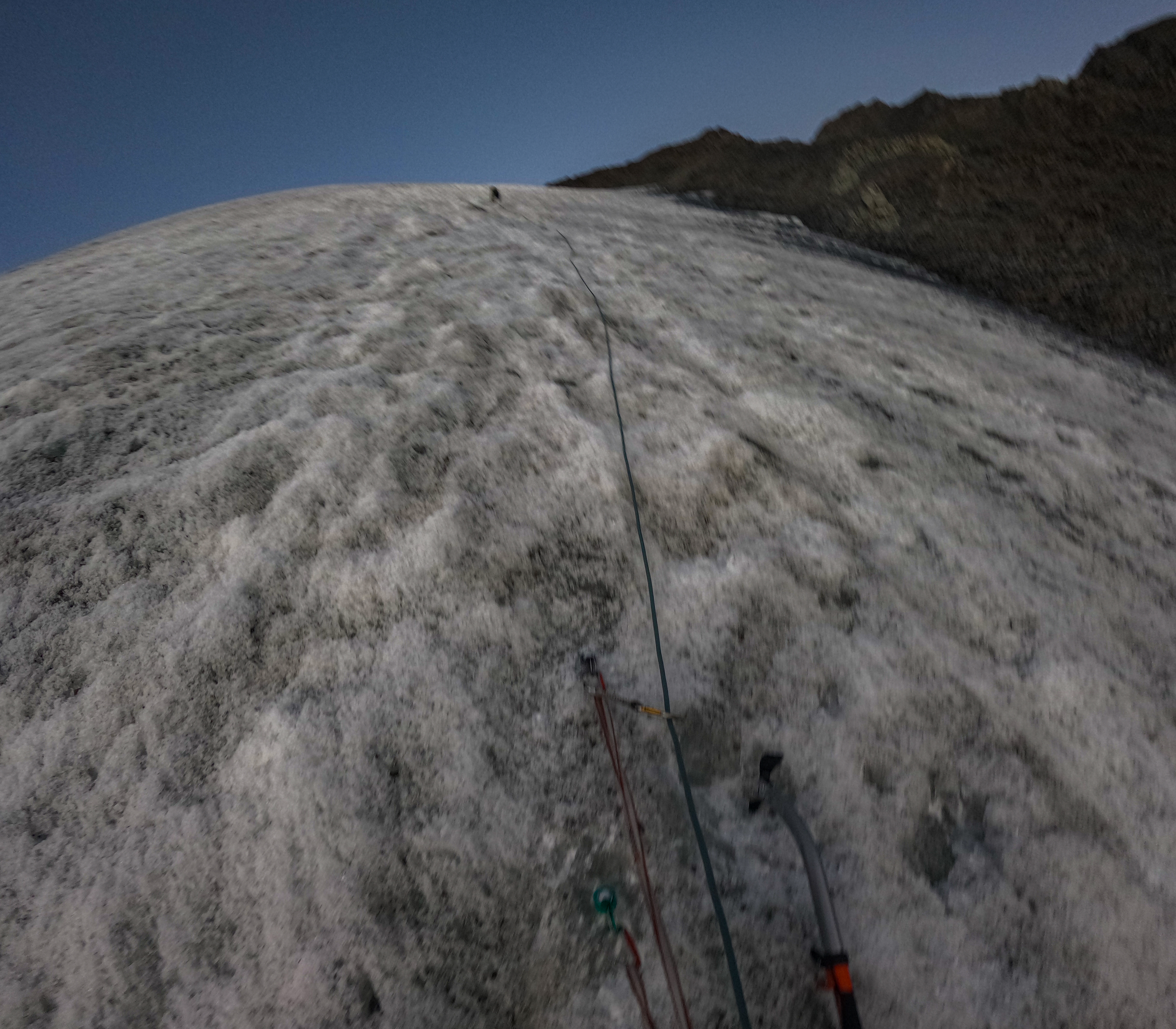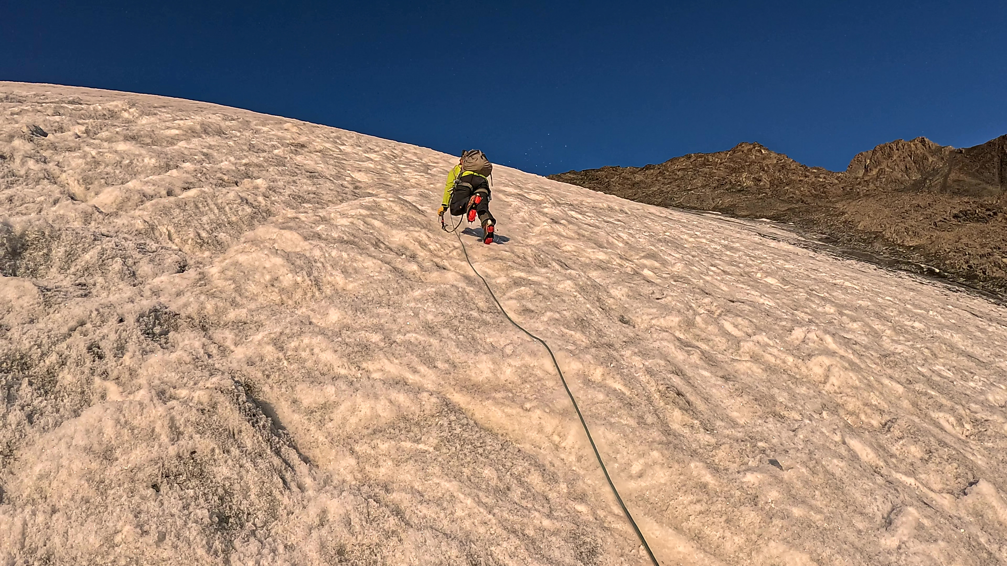 La nuit est claire, une demi-lune éclaire le glacier et les montagnes qui l'entourent. Les conditions de regel sont bonnes. Mais il ne faut pas tarder car nous n'oublions pas que l'ISO 0°C est à 6500 m, il nous faudra redescendre la face avant que le soleil ne la frappe de plein fouet, déclenchant les chutes de pierres.