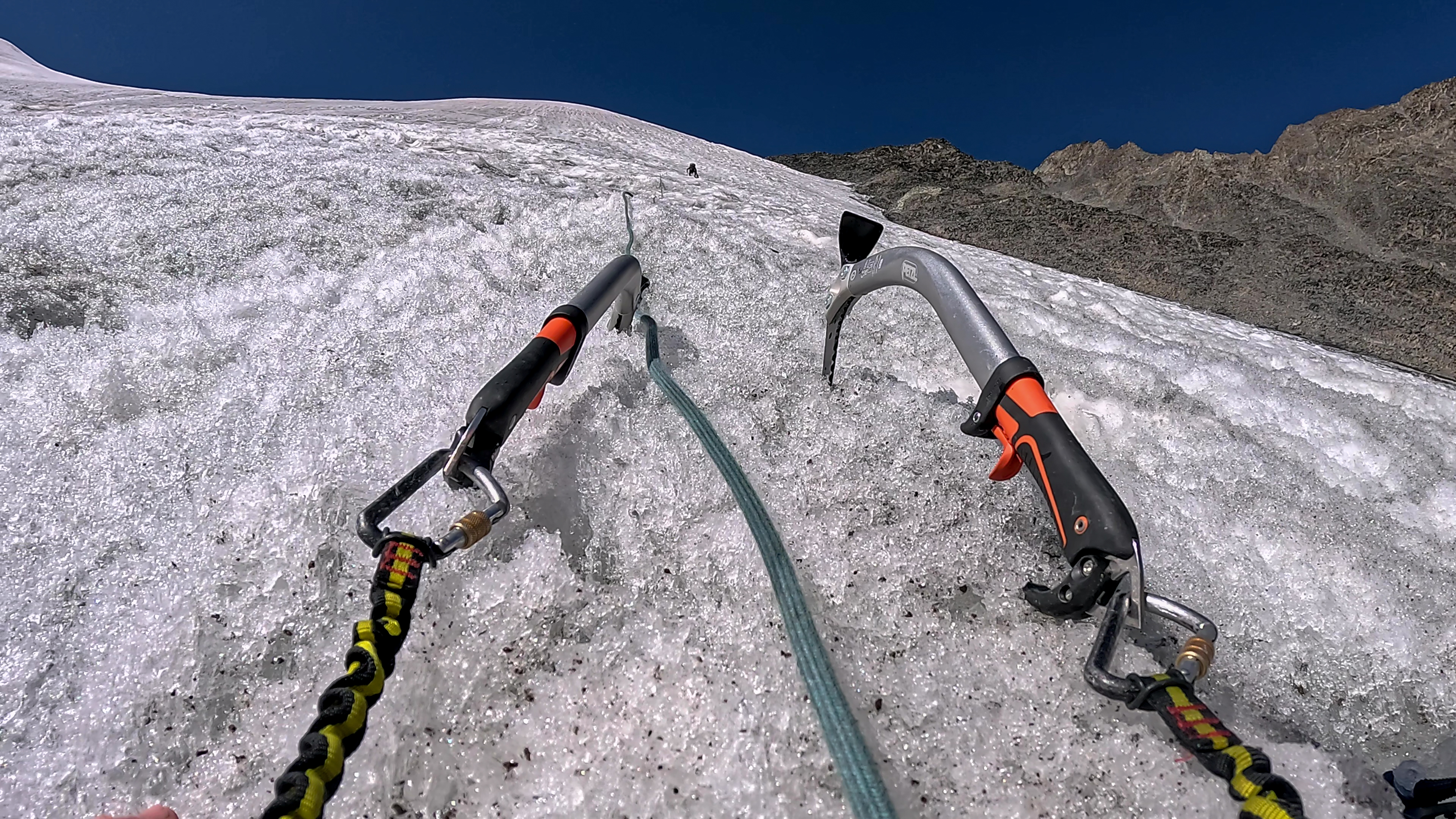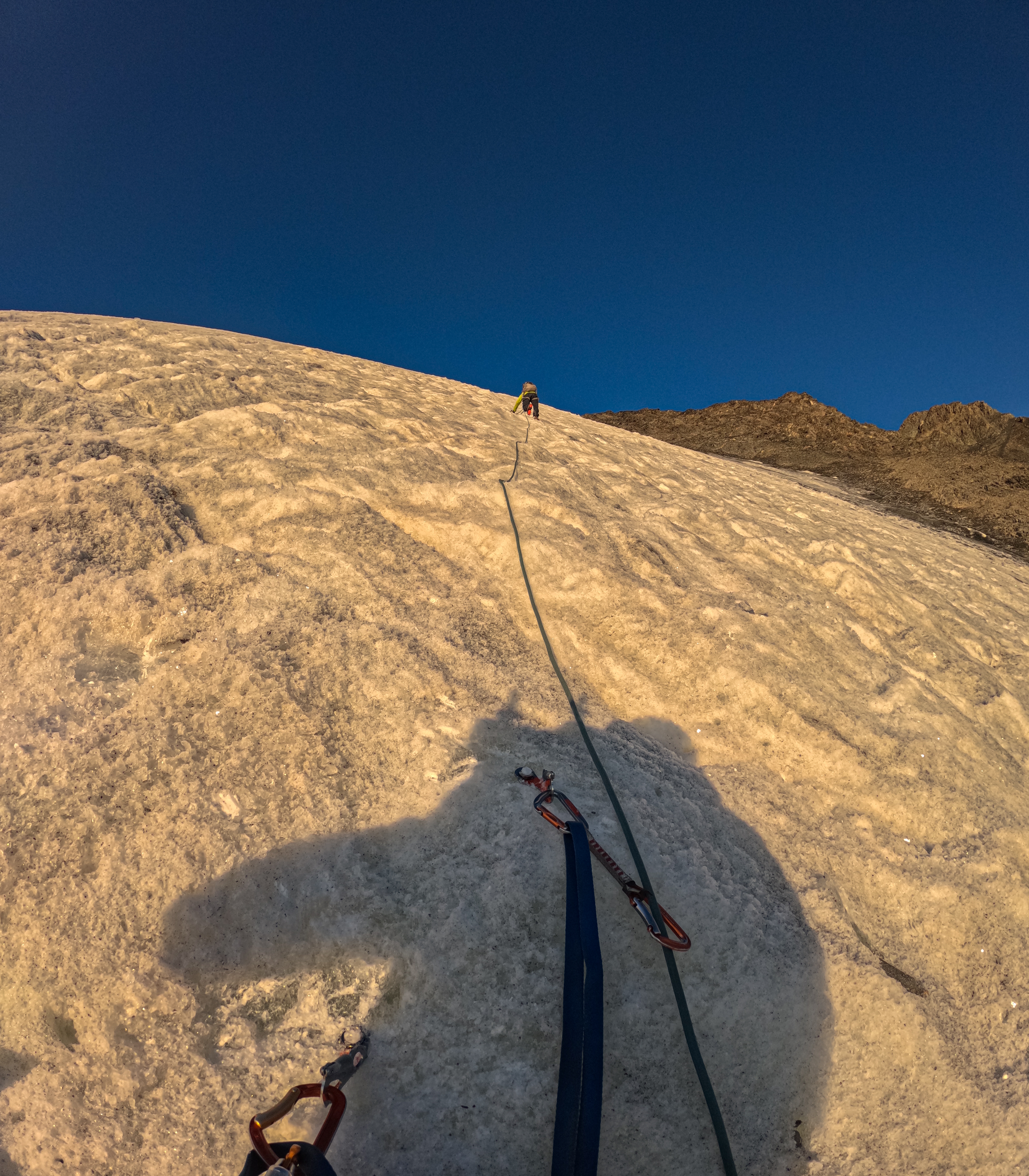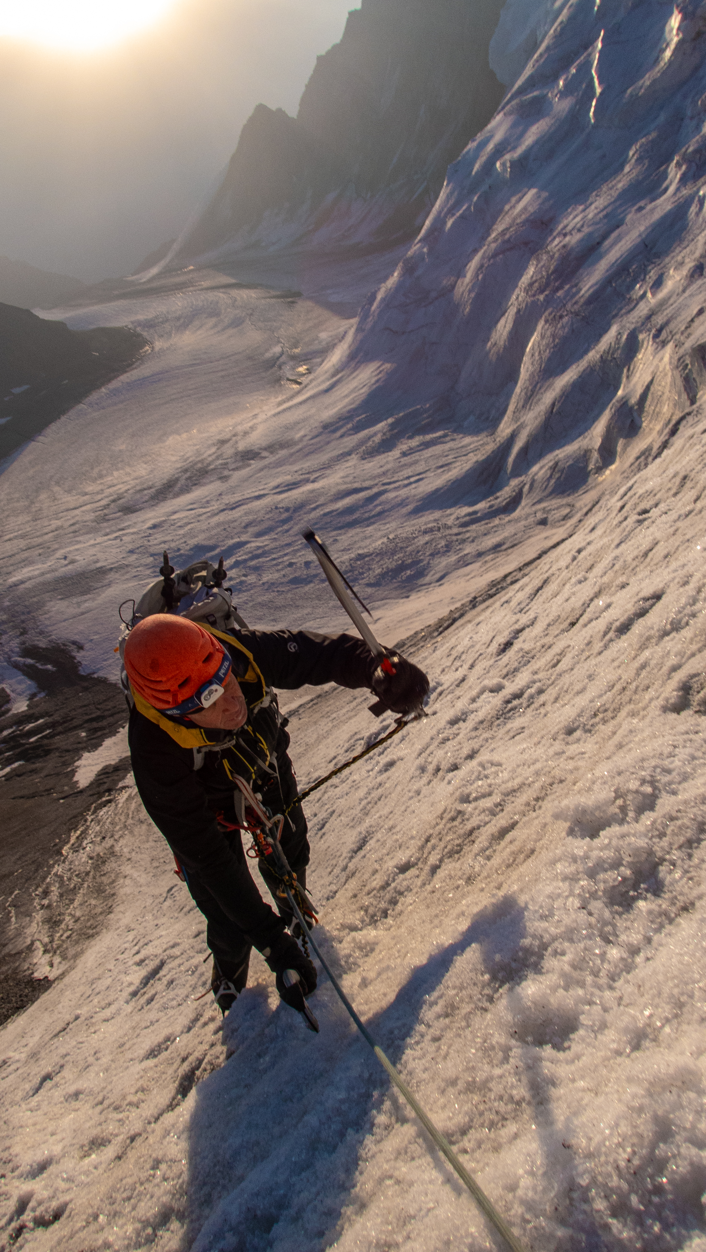 Nous la franchissons et nous nous engageons dans cette face orientée est. Elle est en glace dure et relativement bien fournie. De quoi faire travailler les mollets ! Nous longeons le côté droit de la face, à proximité du rocher qui la longe ; à la descente, il nous faudra nous déporter vers son centre, afin d'être à l'abri des chutes de pierres qui ne vont pas manquer de se déclencher avec le lever du soleil. Une frayeur avec la chute d'un bloc de glace qui vient frapper mon casque. L'inclinaison de la pente est de 45° au début et atteint 60° par la suite. La forme est bonne.